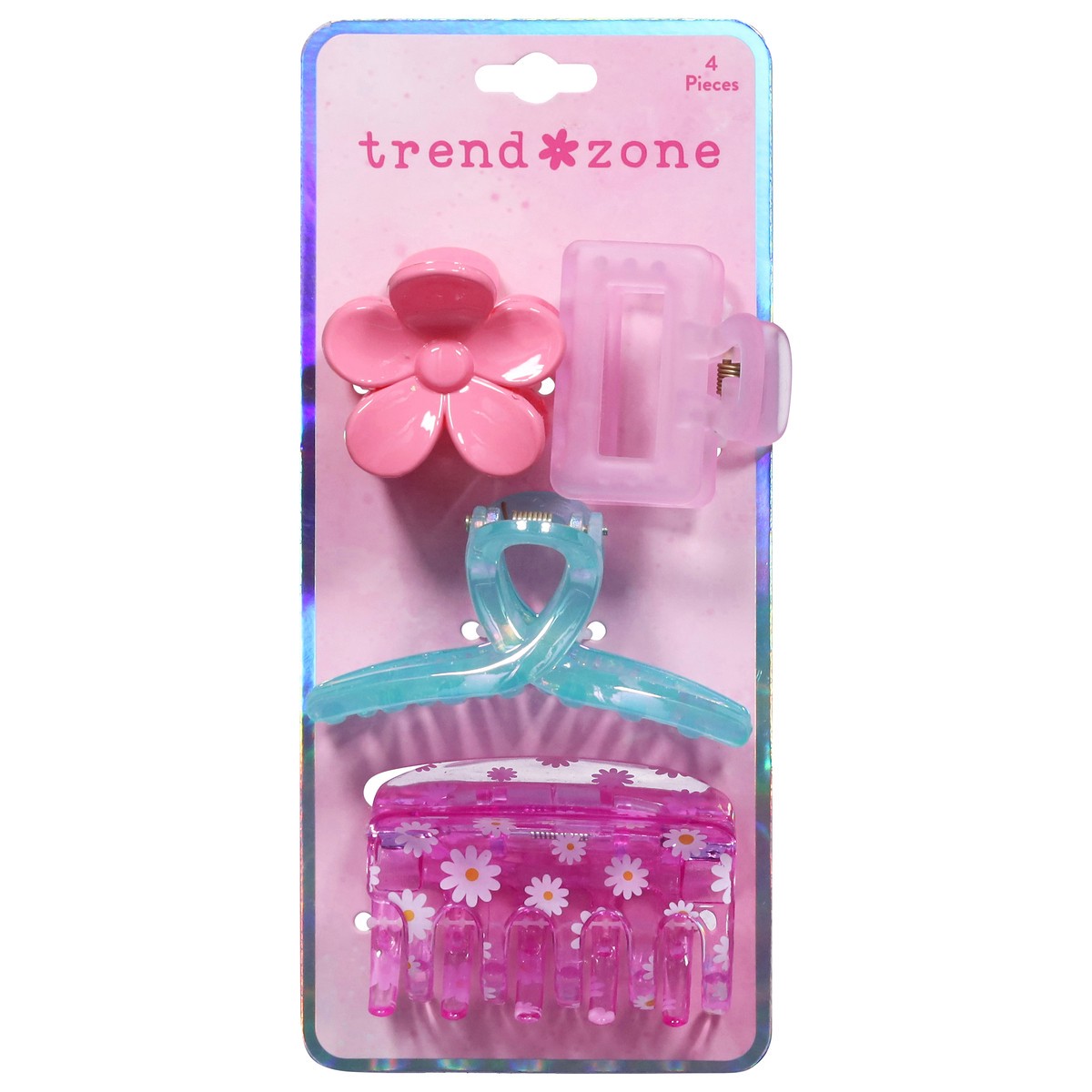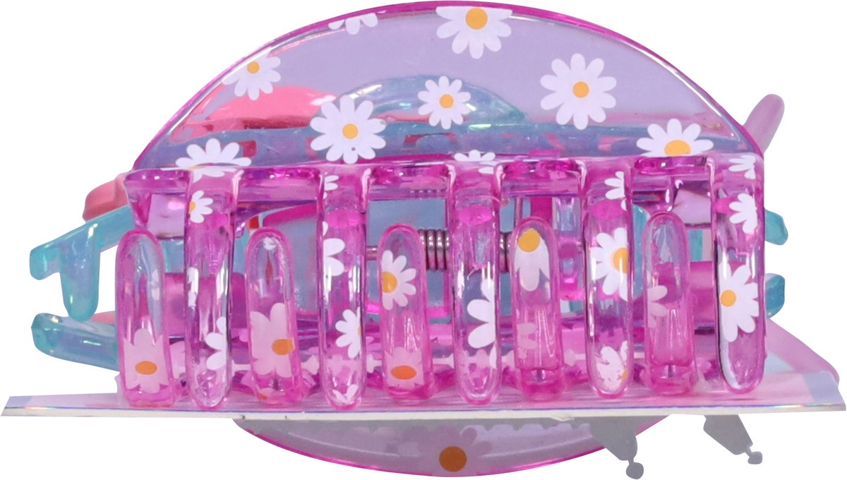 This Assorted Pack of Claw Clips has a clip for every outfit. Set includes pink mini flower, daisy print, fuchsia jelly claw, light lilac open claw and turquoise twist top claw with shimmer coating.
