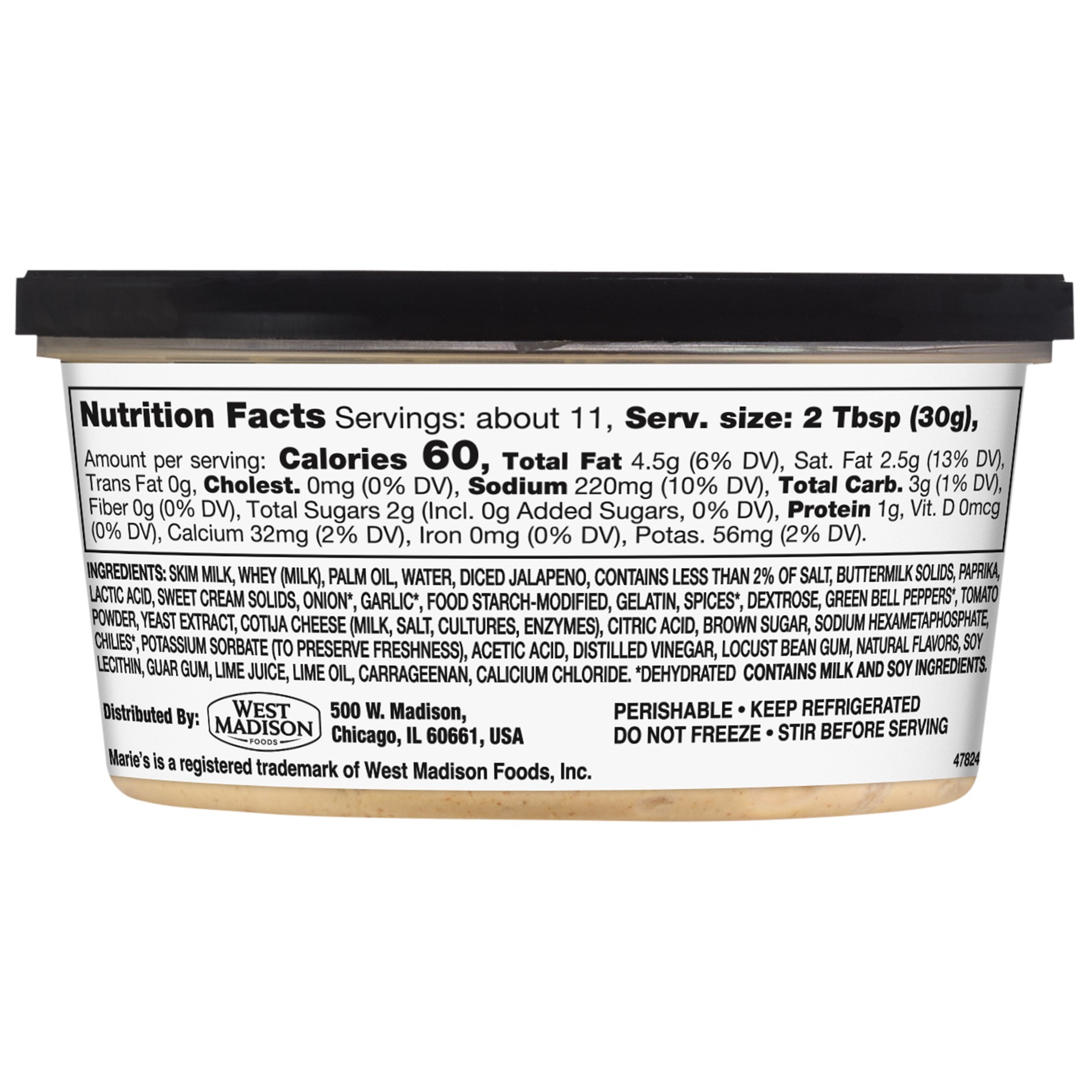 SKIM MILK, WHEY (MILK), PALM OIL, WATER, DICED JALAPENO, CONTAINS LESS THAN 2% OF SALT, BUTTERMILK SOLIDS, PAPRIKA, LACTIC ACID, SWEET CREAM SOLIDS, ONION*, GARLIC*, FOOD STARCH-MODIFIED, GELATIN, SPI…