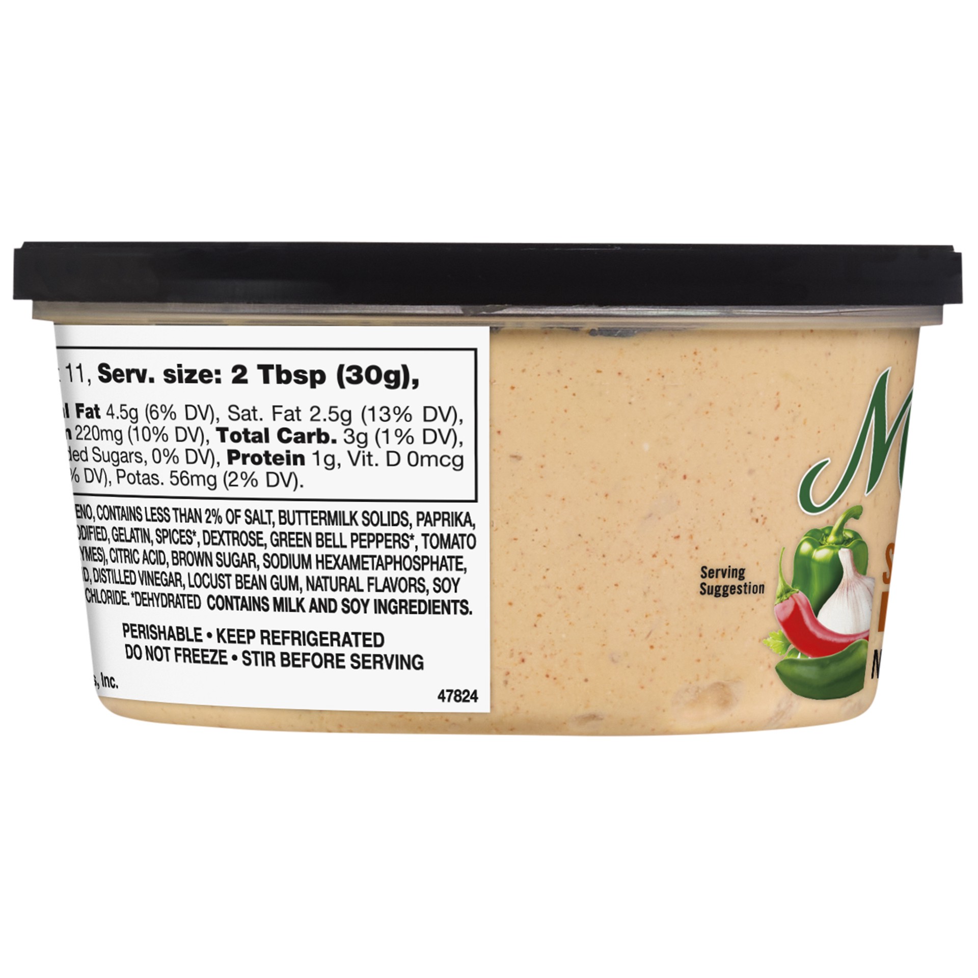 SKIM MILK, WHEY (MILK), PALM OIL, WATER, DICED JALAPENO, CONTAINS LESS THAN 2% OF SALT, BUTTERMILK SOLIDS, PAPRIKA, LACTIC ACID, SWEET CREAM SOLIDS, ONION*, GARLIC*, FOOD STARCH-MODIFIED, GELATIN, SPI…