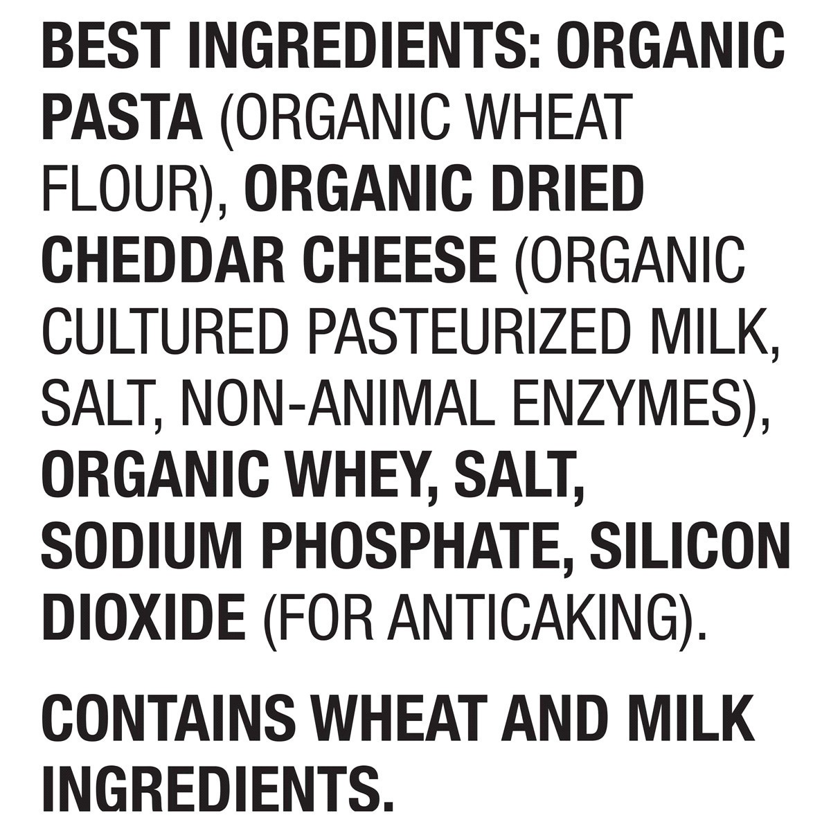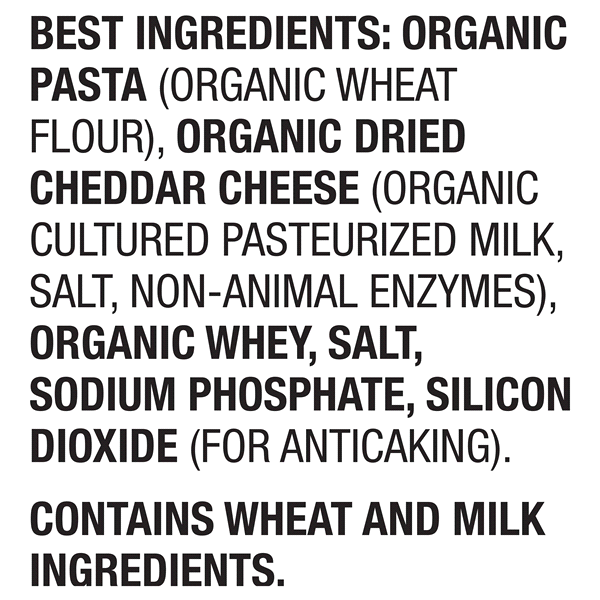 Organic Pasta (Organic Wheat Flour), Organic Dried Cheddar Cheese (Organic Cultured Pasteurized Milk, Salt, Non-Animal Enzymes), Organic Whey, Salt, Sodium Phosphate, Silicon Dioxide (for Anticaking).