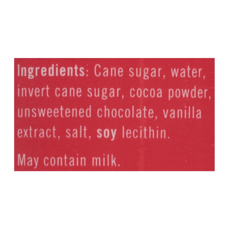 Cane Sugar, Water, Invert Cane Sugar, Cocoa Powder, Unsweetened Chocolate, Vanilla Extract, Salt, Soy Lecithin.