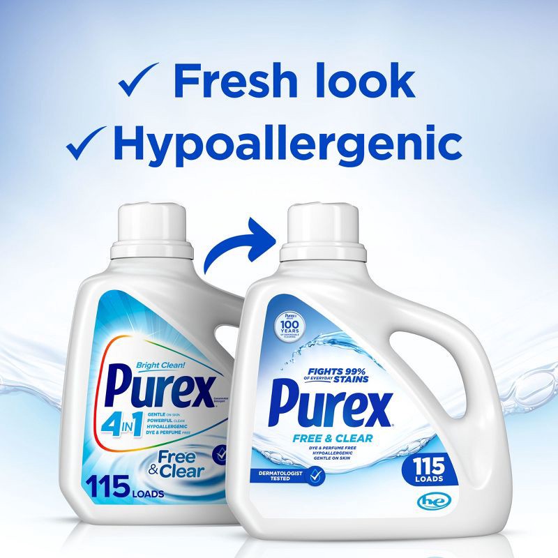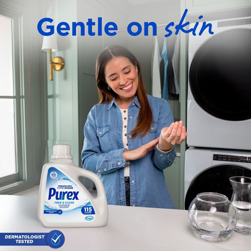 This unique blend of hypoallergenic ingredients delivers the same incredible clean, fresh clothes you've come to expect from Purex without the perfume or dyes. Purex Free and Clear laundry detergent i…