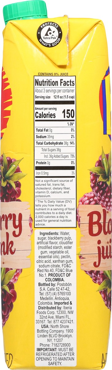 Water, Sugar, Blackberry Pulp, Artificial Flavor, Cloudifier (Modified Starch, Ester Gum, Vegetable Oil, Essential Oils), Pectin, Citric Acid, Xanthan Gum, Sodium Citrate, FD&C Red 40, FD&C Blue 1.