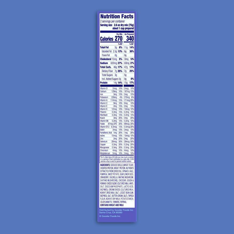 Goodles Shells (Wheat Flour, Chickpea Protein, Wheat Protein, Nutrients Extracted from [Broccoli, Spinach, Kale, Pumpkin, Sweet Potato, Sunflower Seed, Cranberry, Chlorella, Maitake Mushroom, Shiitake…
