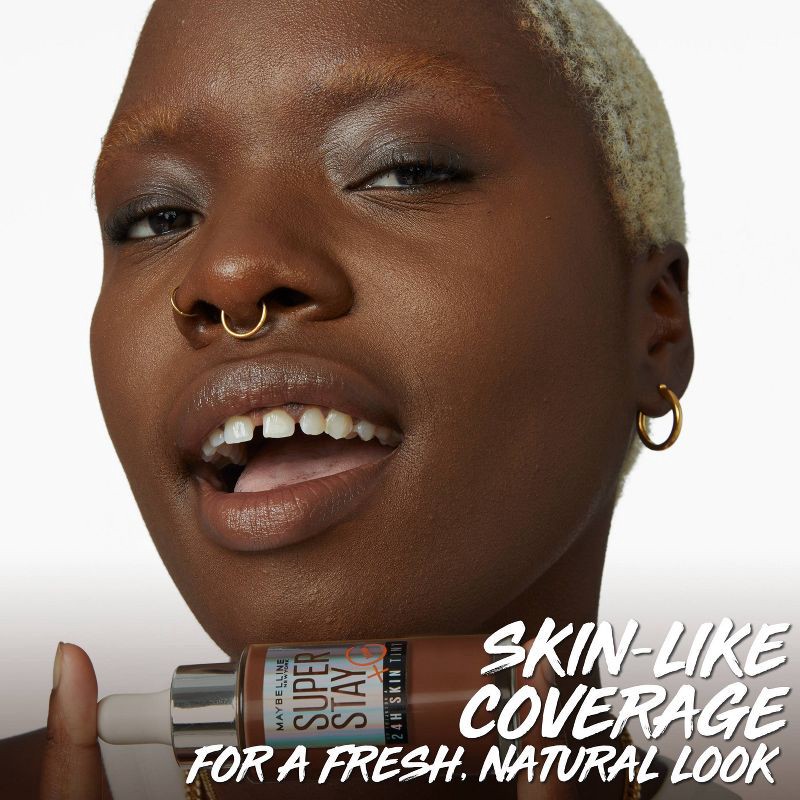 - Super Stay Skin Tint: Introducing Maybelline's 1st long wear skin tint infused with Vitamin C; Delivers bright, skin-like light foundation coverage to medium foundation coverage; A weightless feeling face makeup with up to 24HR foundation makeup wear; Resists sweat, humidity and fading