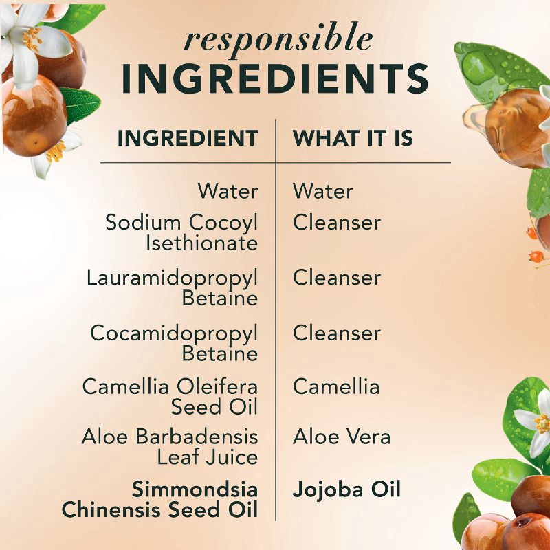 Water, Sodium Cocoyl Isethionate, Lauramidopropyl Betaine, Cocamidopropyl Betaine, Sodium Lauroyl Sarcosinate, Fragrance, Camellia Oleifera Seed Oil, Aloe Barbadensis Leaf Juice, Simmondsia Chinensis …