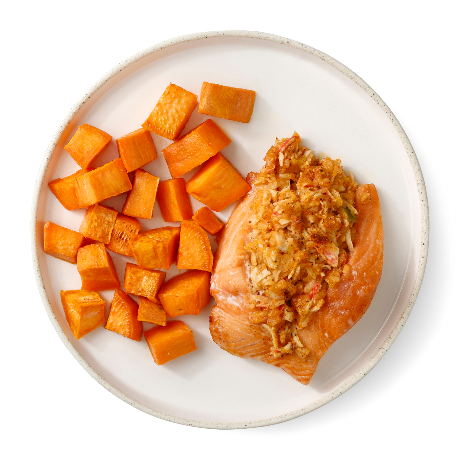 Savor this salmon topped with bacon bits and stuffed with a savory seafood salad, paired with sweet potatoes.