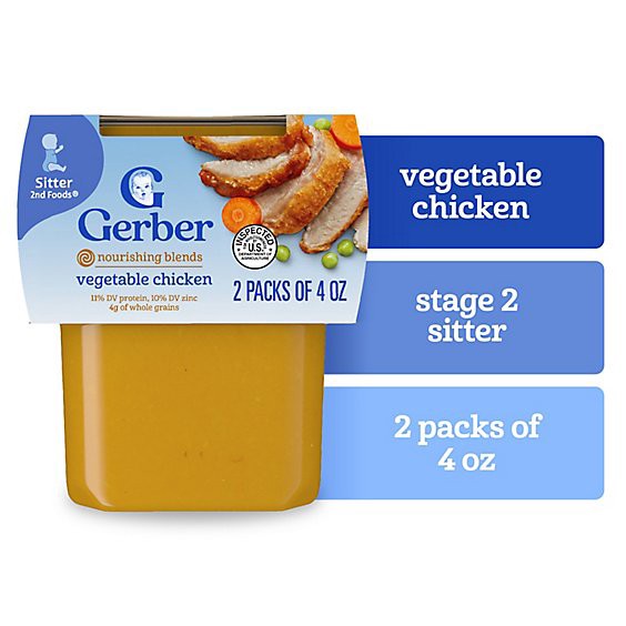 Gerber 2nd Foods Vegetable Chicken Dinner Baby Food is a delicious chicken and vegetables puree that makes feeding time a treat. This vegetable baby food stage 2 recipe includes 1/4 cup vegetables, 1-…