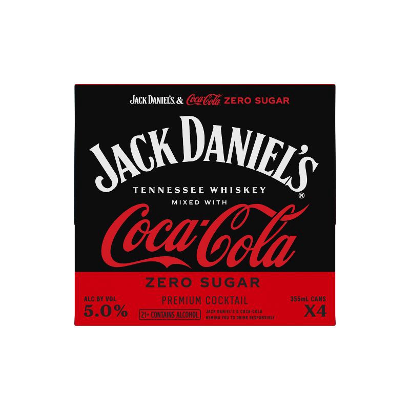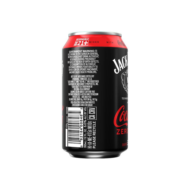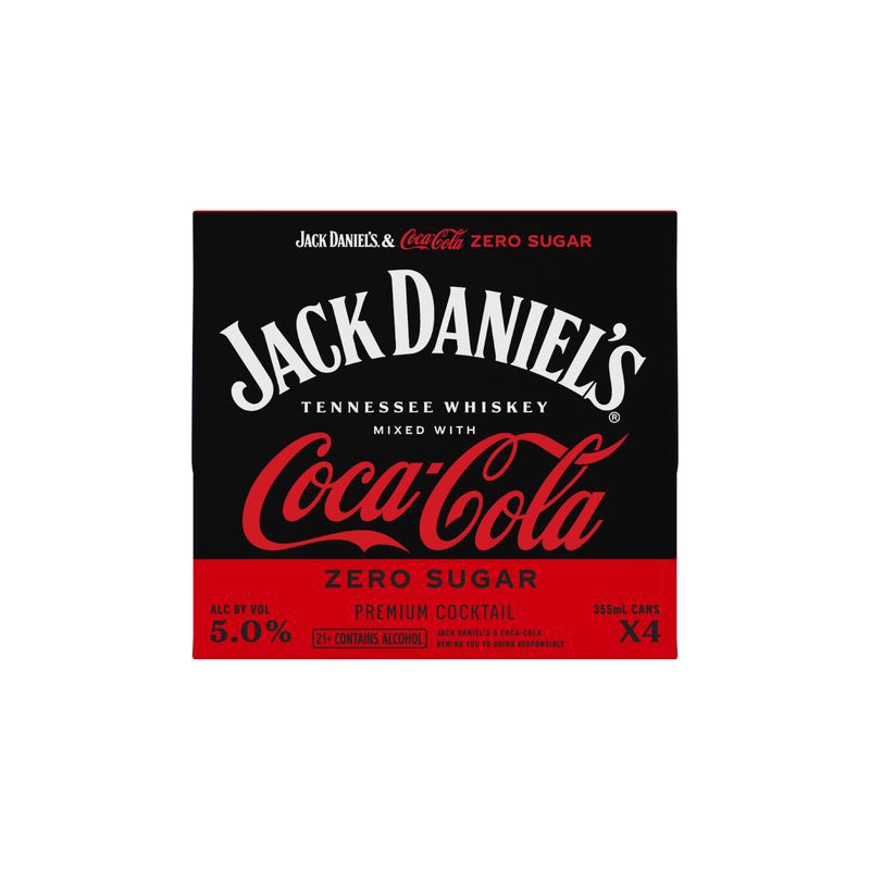 - One 355 mL can of Jack Daniel's® & Coca-Cola Zero Sugar Ready to Drink Whiskey Cocktail, 10 Proof, 5% ABVThe perfect mix of Jack Daniel's Tennessee Whiskey and Coca-Cola sugar free sodaReady-to-drink canned soda and whiskey cocktail inspired by the Jack and Coke cocktailCanned cocktails best served cold from the soda cans or over icePer 12 fluid ounces — Average Analysis: Calories 140, Carbs 0g, Protein 0g, Fat 0g. Coca-Cola Zero Sugar contributes zero calories and zero sugar