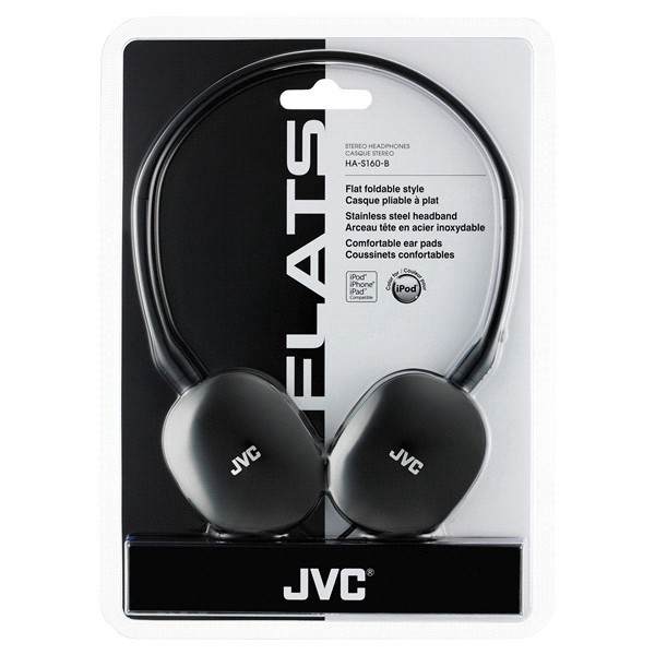 The Black JVC HA-S160 FLATS are stylish, compact headphones with a slim metallic headband and sleek, soft ear pads that rest on the ear. The earpieces pivot so that the headphone can lie flat, making …
