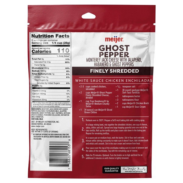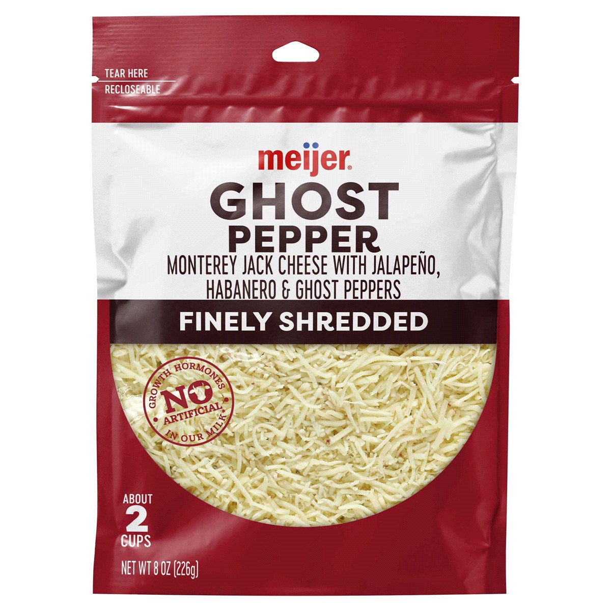 Meijer's Finely Shredded Ghost Pepper Cheese is a spicy blend of Monterey Jack with Jalapeno, Habanero, and Ghost peppers. Finely shredded for easy use, it's perfect for enhancing dishes with a fiery …