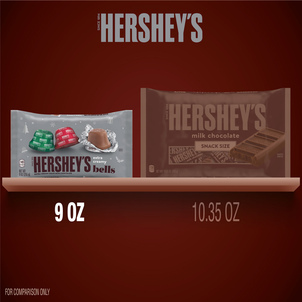 - Contains one (1) 9-ounce bag of HERSHEY'S Milk Chocolate Bells Christmas CandyBring individually wrapped milk chocolate candies to your next holiday movie night for an extra festive viewingSolid