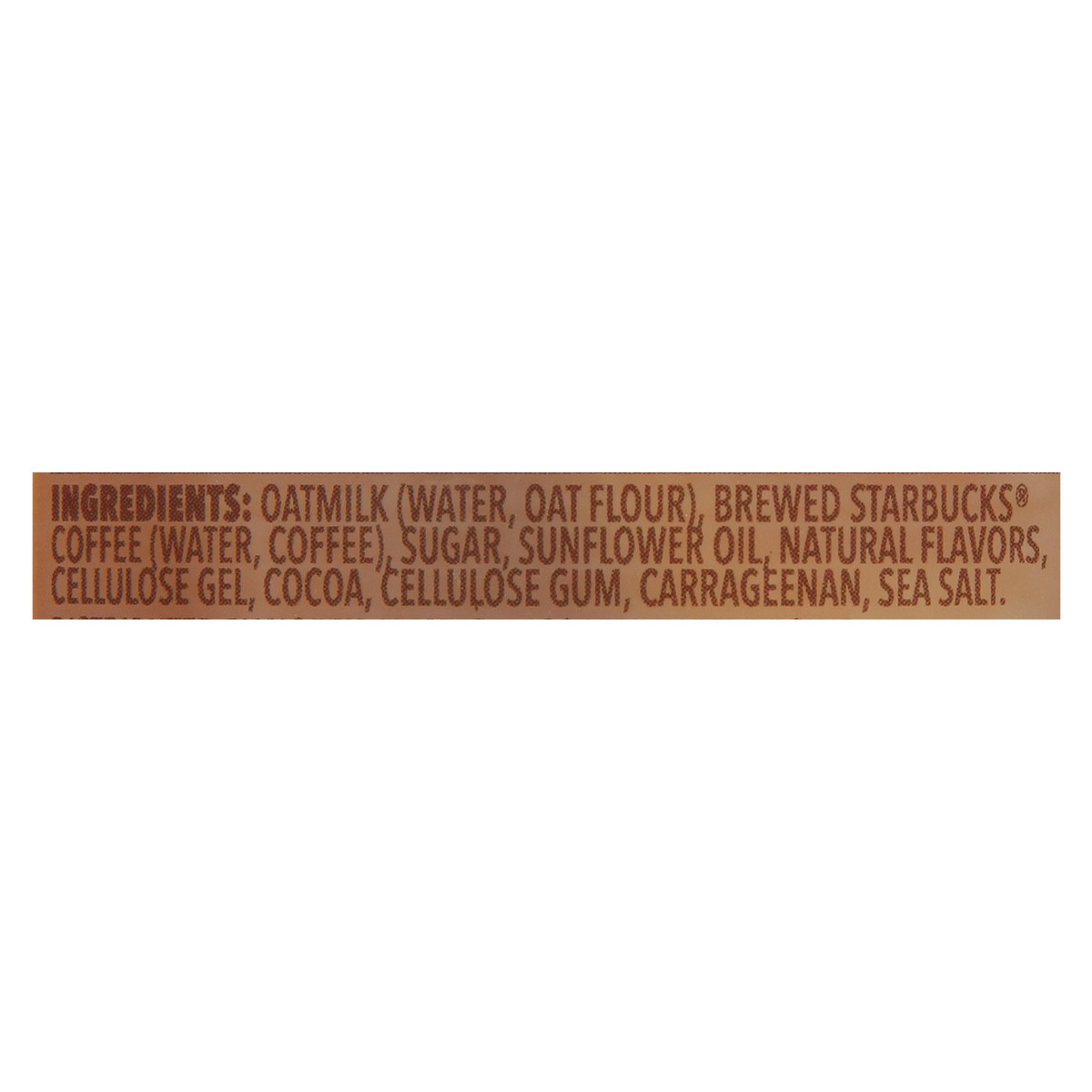 Oatmilk (Water, Oat Flour), Brewed Starbucks Coffee (Water, Coffee), Sugar, Sunflower Oil, Natural Flavors, Cellulose Gel, Cocoa, Cellulose Gum, Carrageenan, Sea Salt.