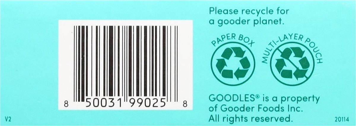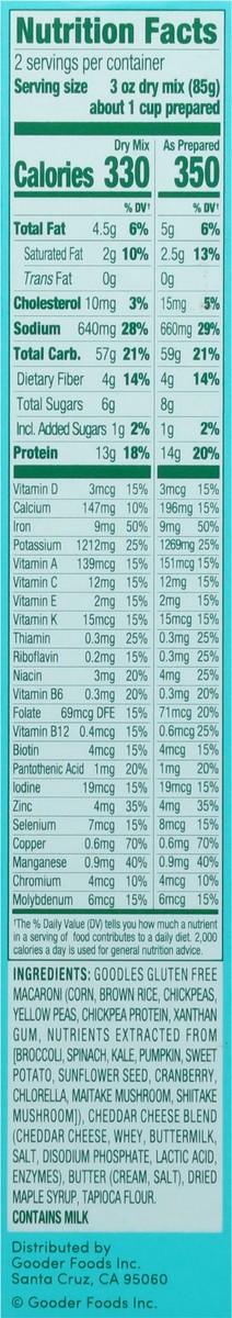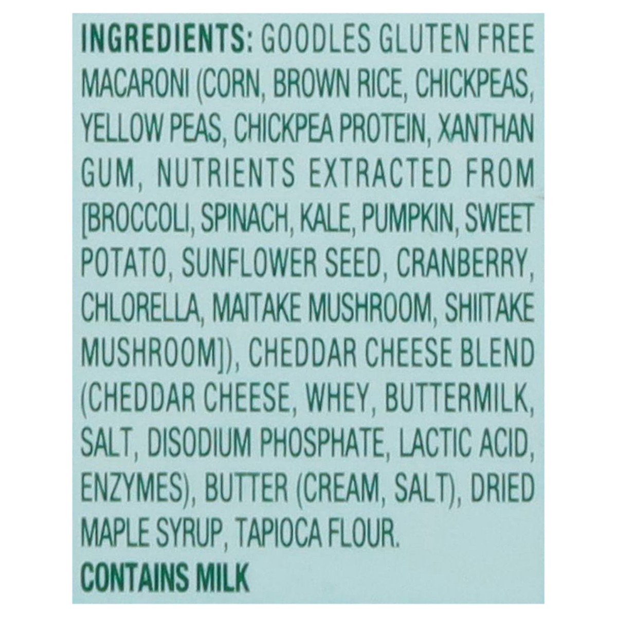 GOODLES GLUTEN FREE MACARONI (CORN, BROWN RICE, CHICKPEAS, YELLOW PEAS, CHICKPEA PROTEIN, XANTHAN GUM, NUTRIENTS EXTRACTED FROM [BROCCOLI, SPINACH, KALE, PUMPKIN, SWEET POTATO, SUNFLOWER SEED, CRANBER…