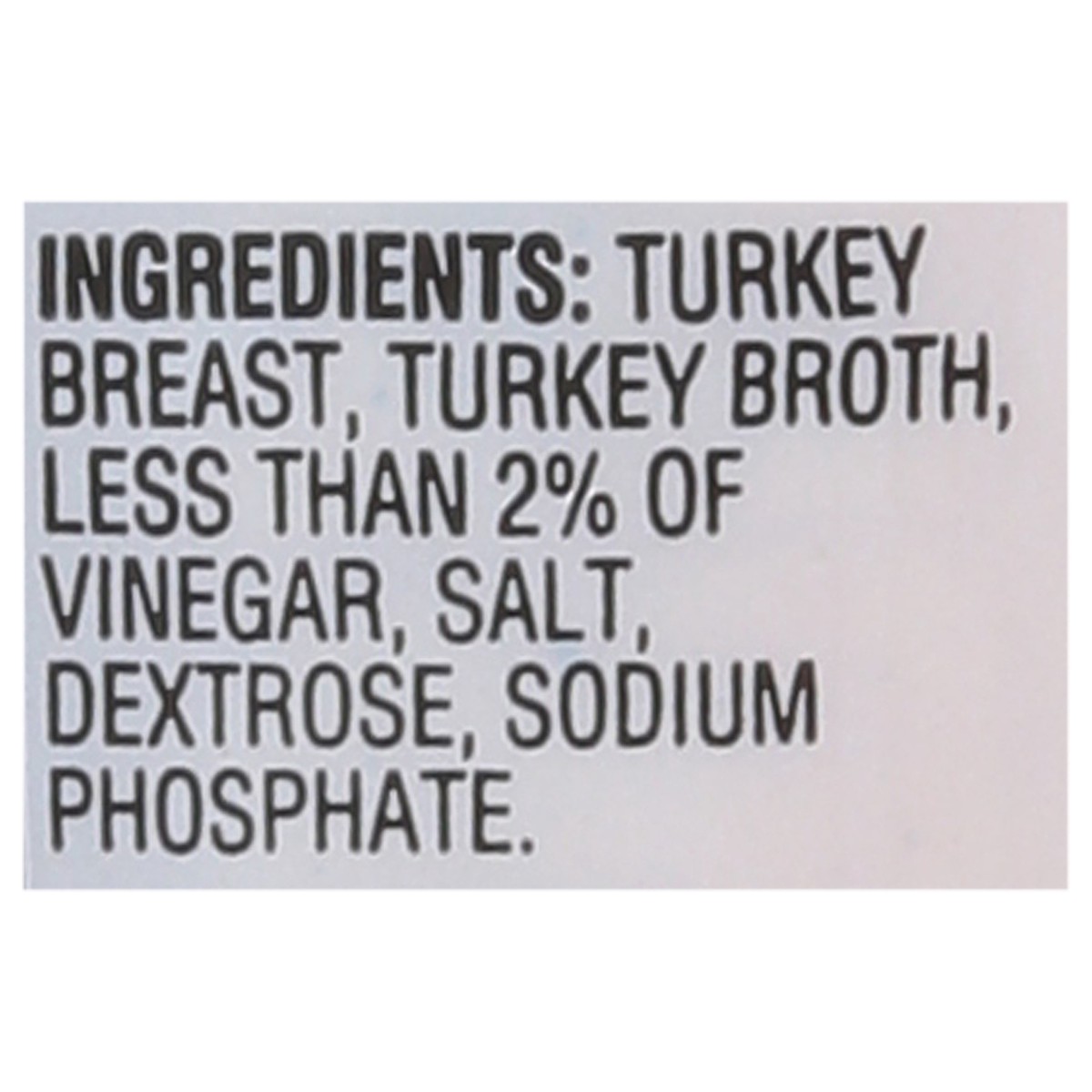Turkey Breast Meat, Turkey Broth, Contains 2% or Less Salt, Vinegar, Sugar, Sodium Phosphate, Natural Smoke Flavoring, Sodium Erythorbate, Sodium Nitrite.