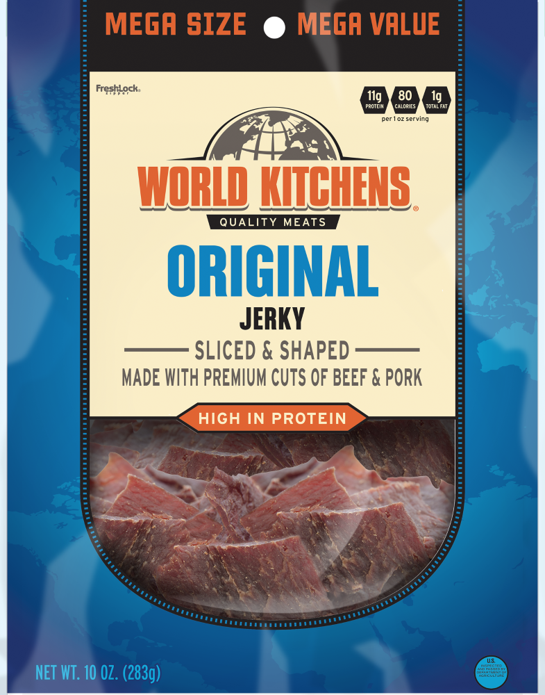 Made with premium cuts of beef & pork. High in protein. Quality meats. Per 1 oz Serving: 11 g protein; 80 calories; 1 g total fat. Mega value. FreshLock zipper. US inspected and passed by Department o…