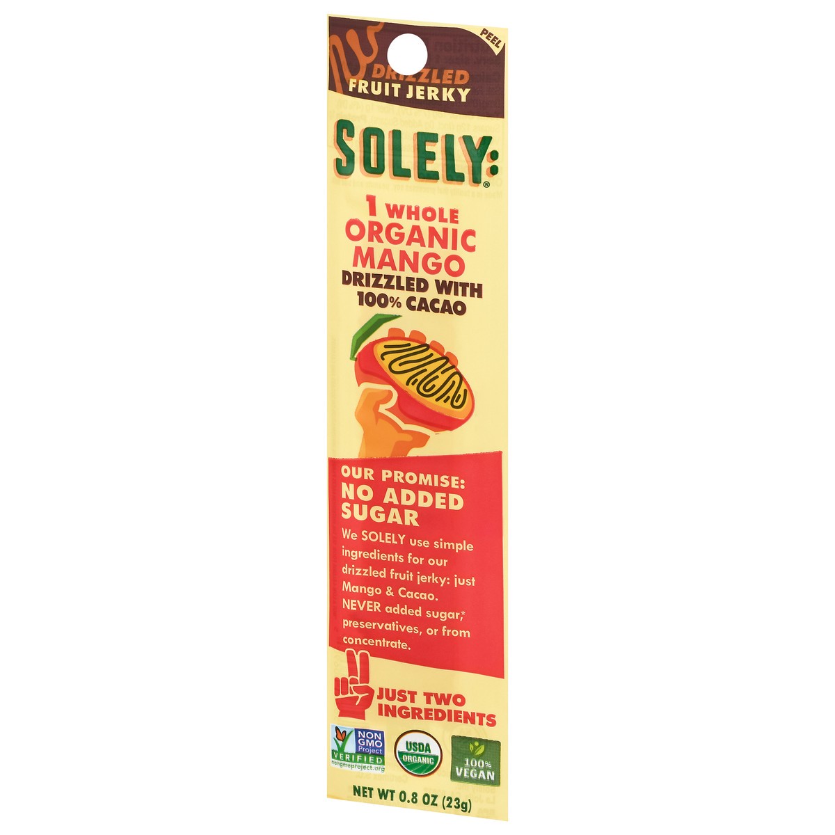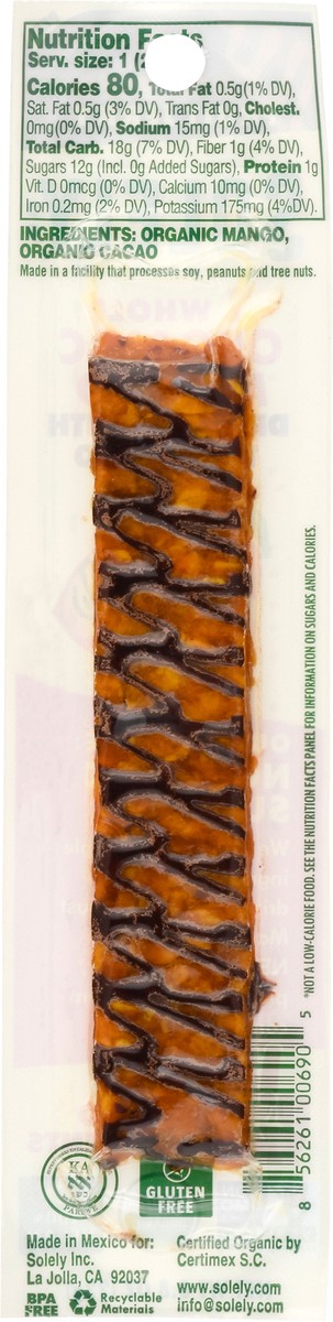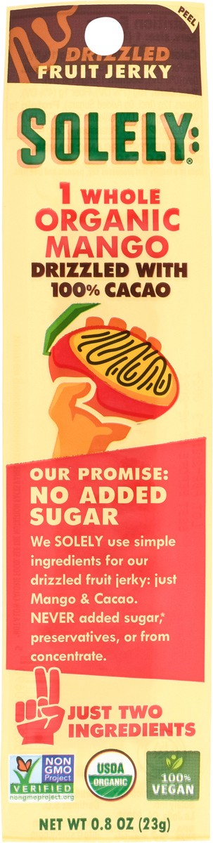 1 whole organic mango. Our Promise: We solely use simple ingredients for our drizzled fruit jerky: Just mango & cacao. Just two ingredients.