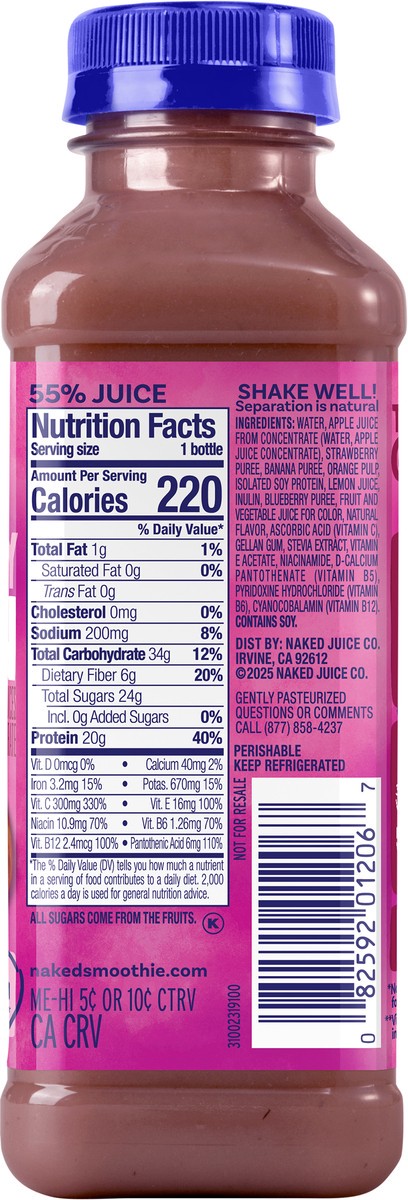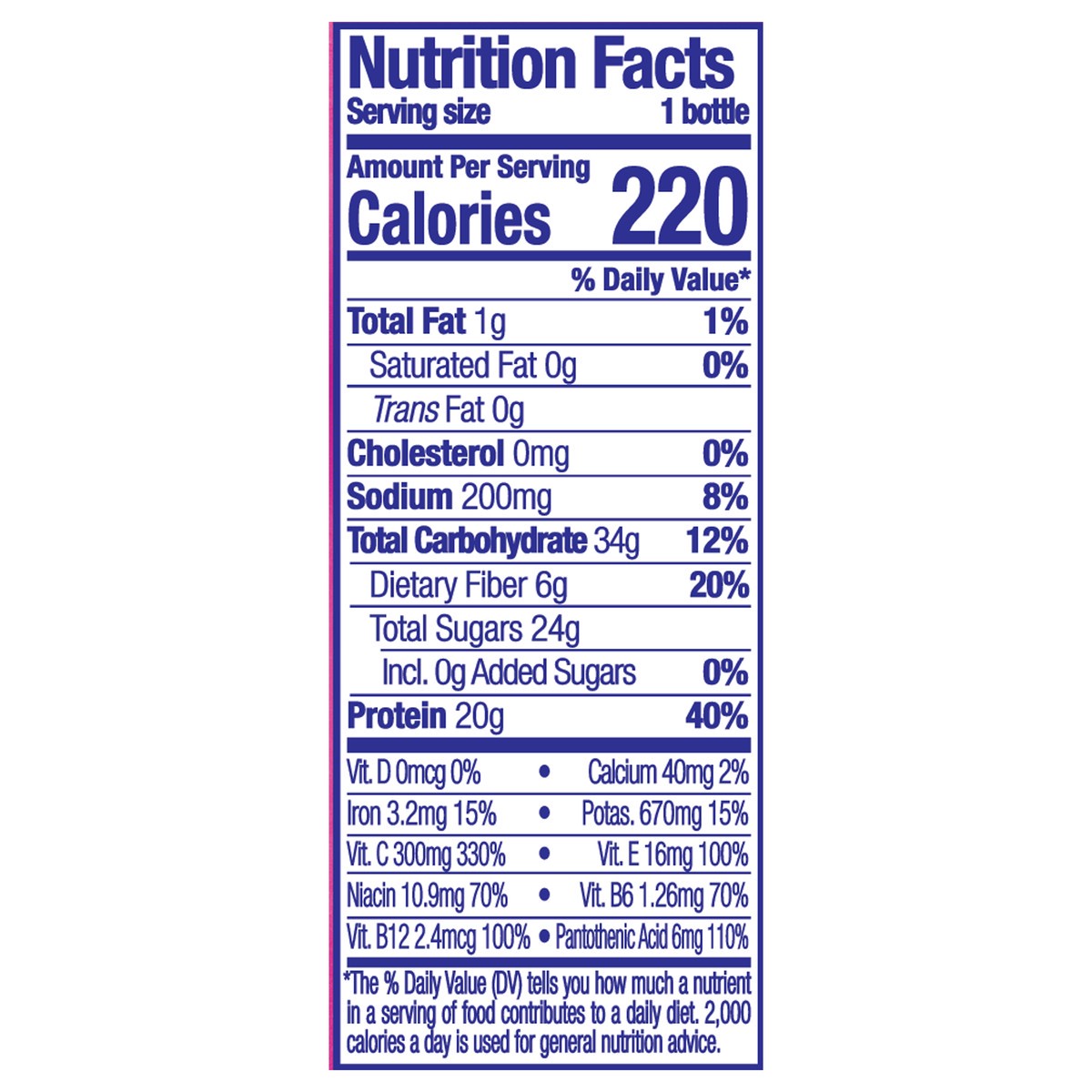 Water, Apple Juice from Concentrate (Water, Apple Juice Concentrate), Strawberry Puree, Banana Puree, Orange Pulp, Isolated Soy Protein, Lemon Juice, Inulin, Blueberry Puree, Fruit and Vegetable Juice…