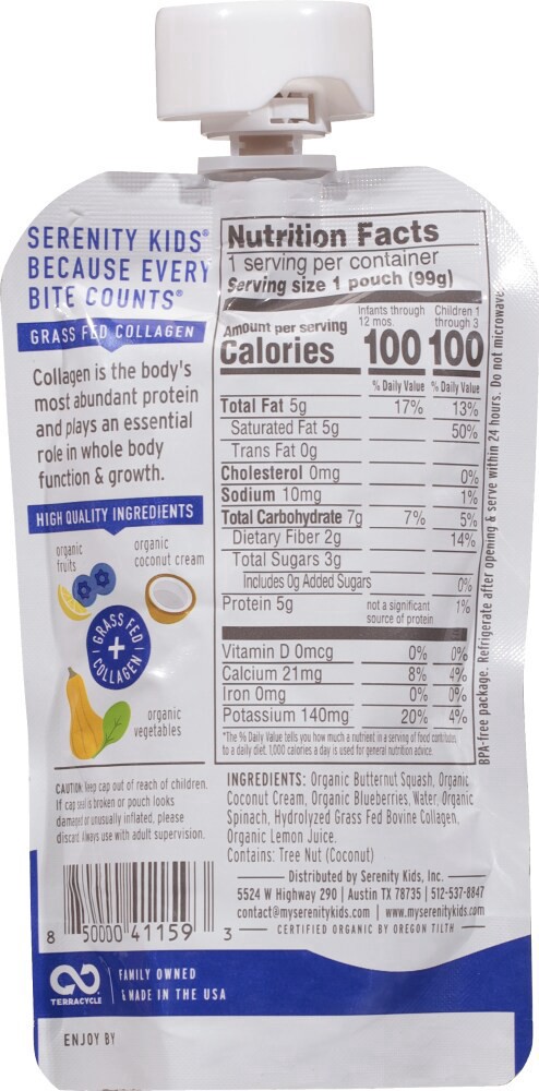 Serenity Kids Dairy Free Organic Berry & Butternut Smoothie + Protein with Grass Fed Collagen Baby Food Pouch - 3.5oz