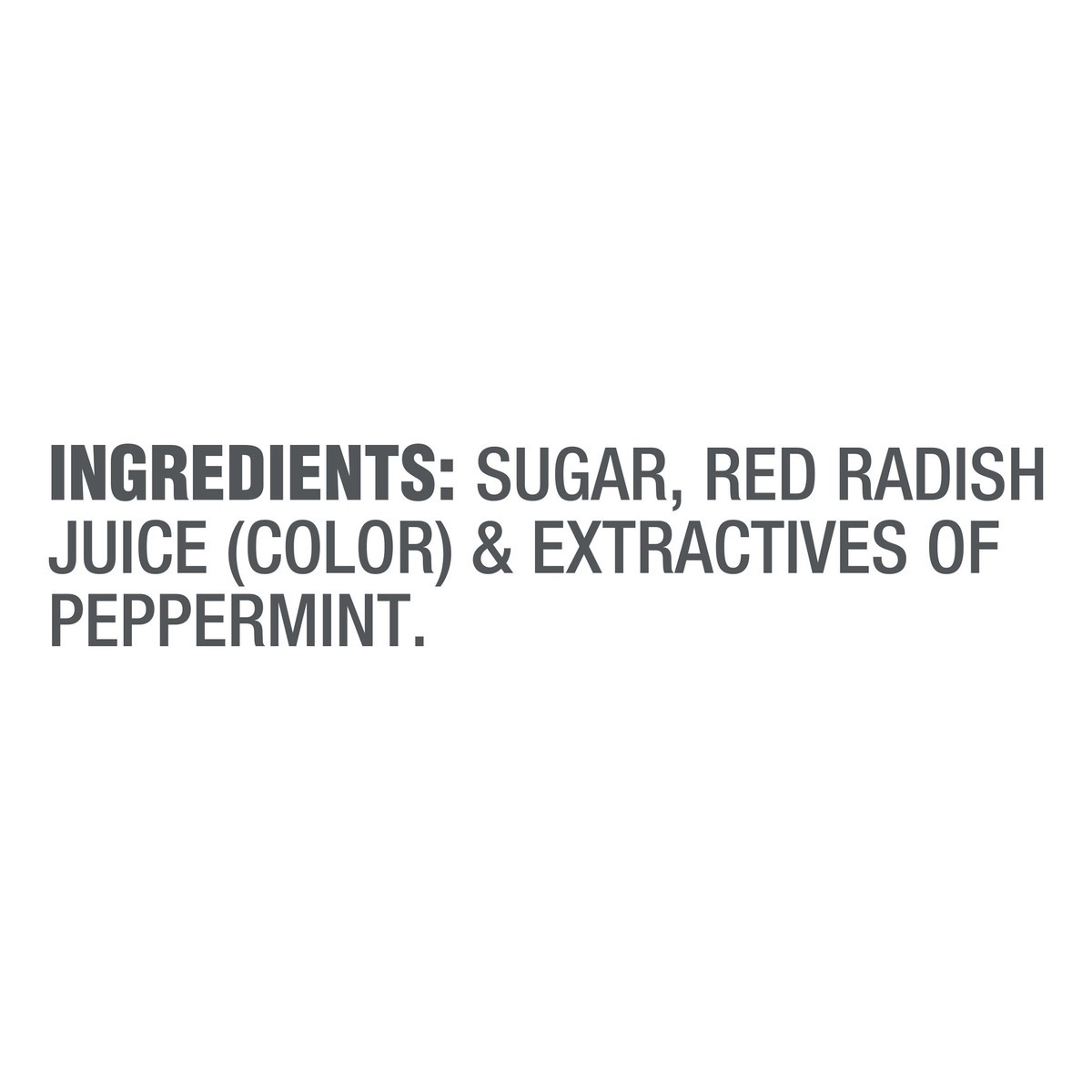 - Made with sugar, red radish juice (for color), and extractives of peppermint