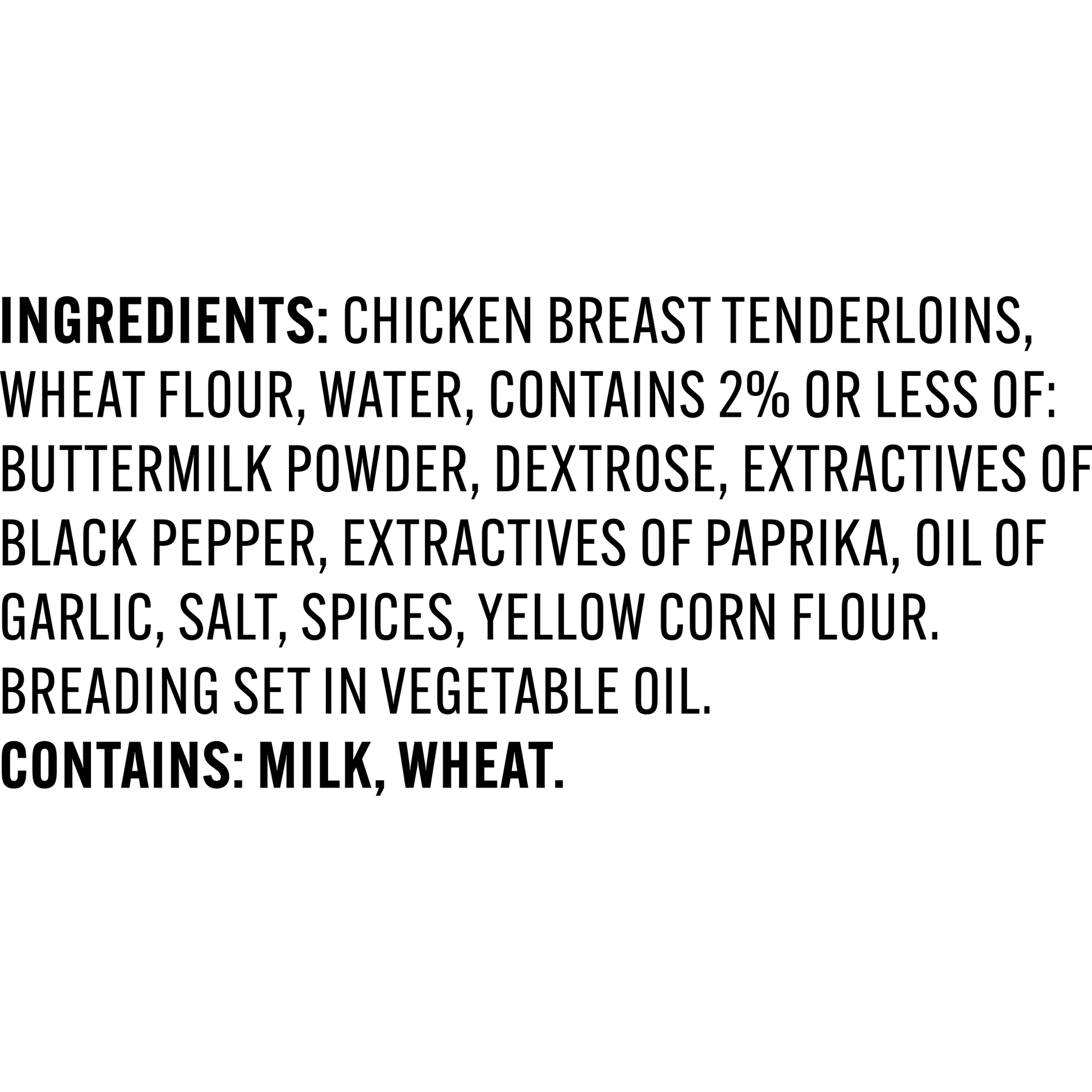 Chicken breast tenderloins, wheat flour, water, contains 2% or less of: buttermilk powder, dextrose, extractives of black pepper, extractives of paprika, oil of garlic, salt, spices, yellow corn flour…