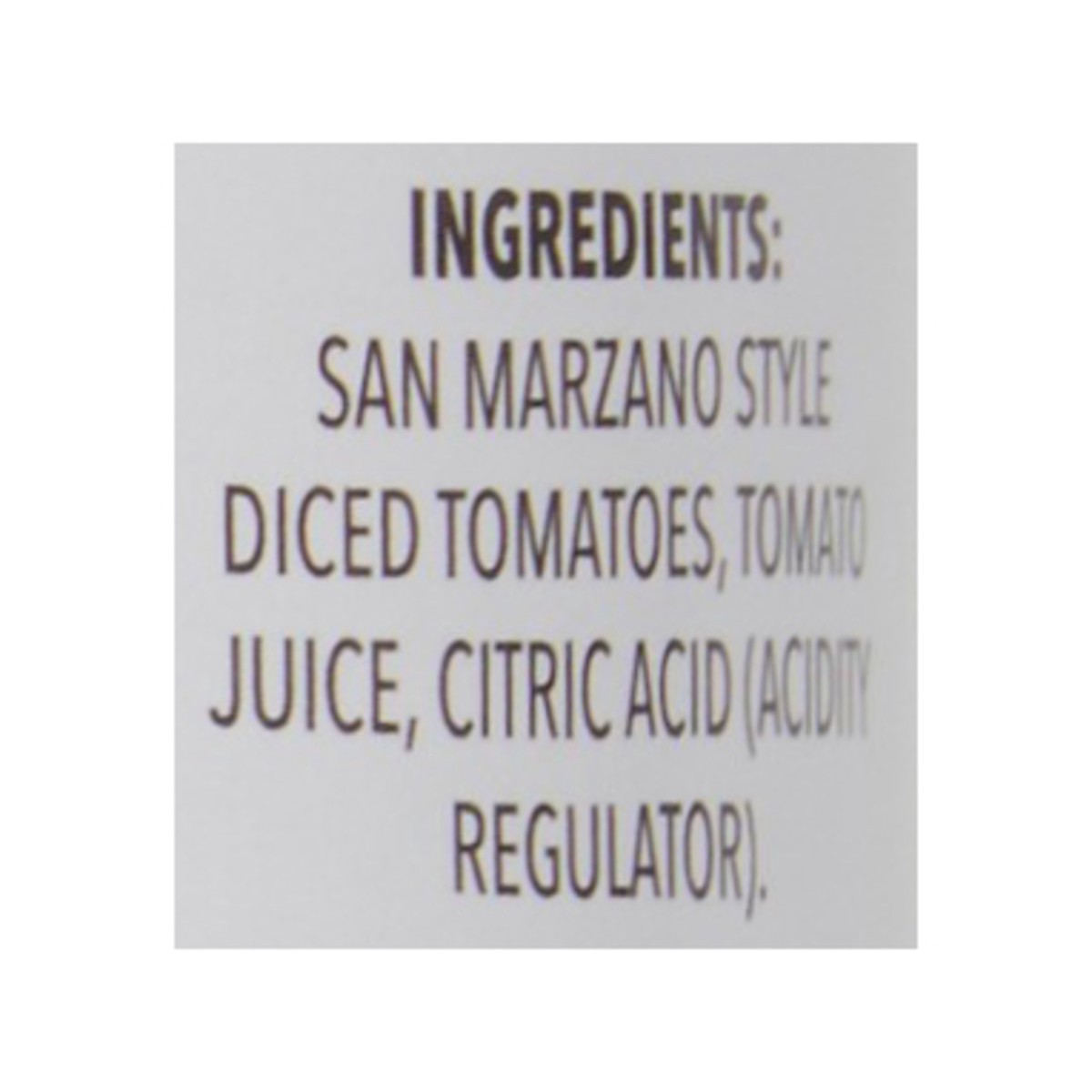 San Marzano Style Diced Tomatoes, Tomato Juice, Citric Acid (Acidity Regulator).