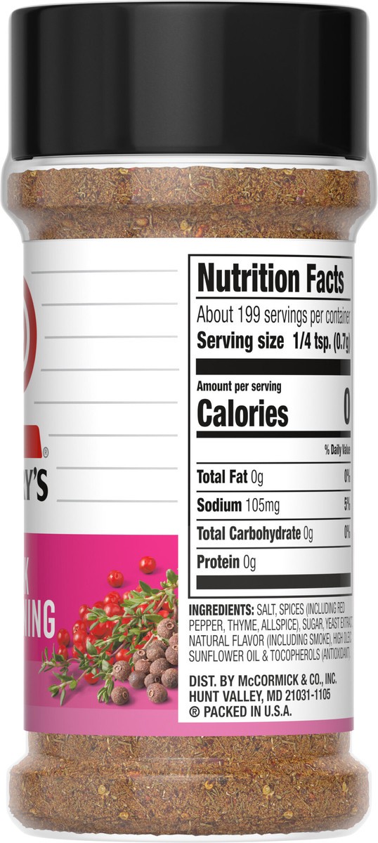 Salt, Spices (Including Red Pepper, Thyme, Allspice), Sugar, Yeast Extract, Natural Flavor (Including Smoke), High Oleic Sunflower Oil & Tocopherols (Antioxidant).