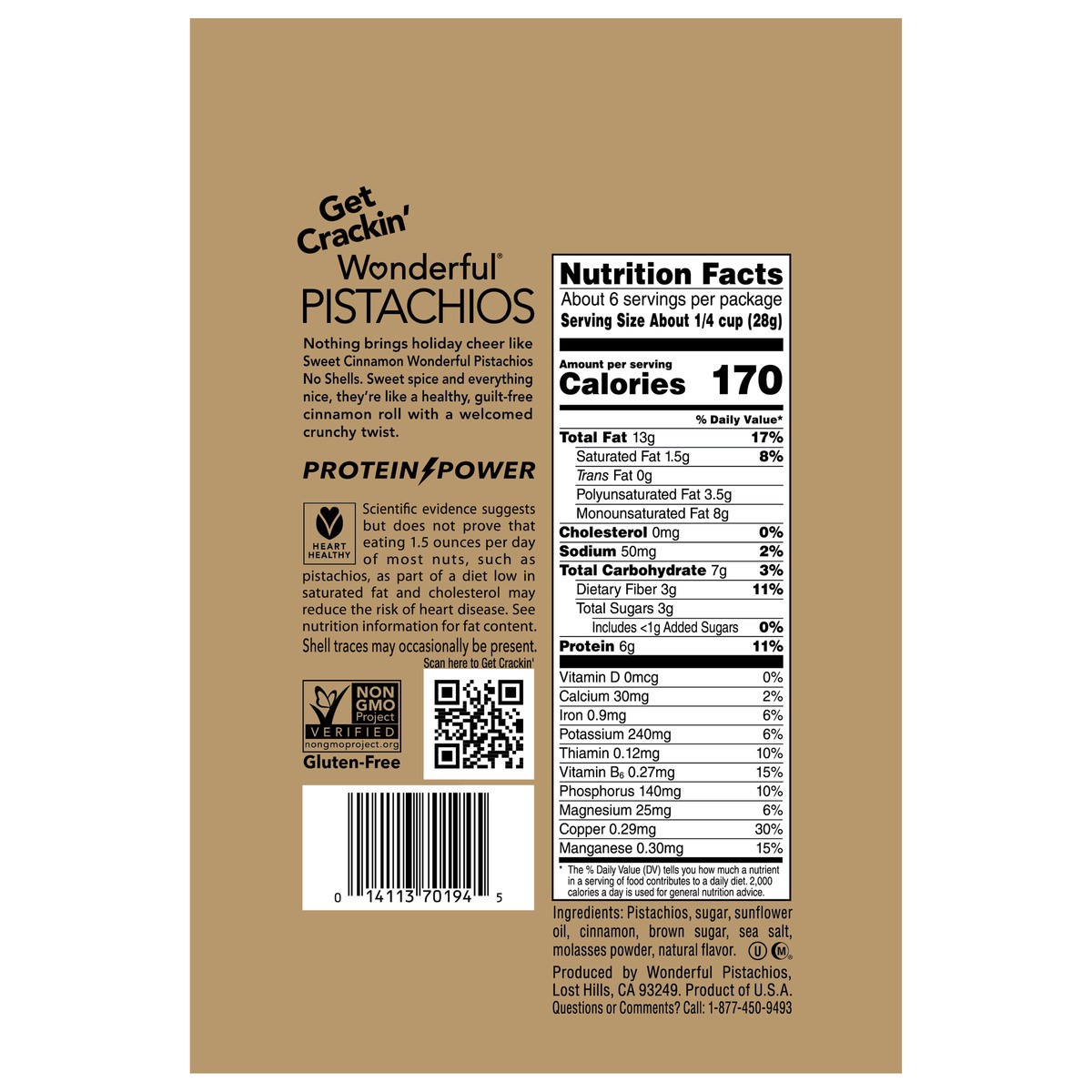 Pistachios, Sugar, Sunflower Oil, Cinnamon, Brown Sugar, Sea Salt, Molasses Powder, Natural Flavor.