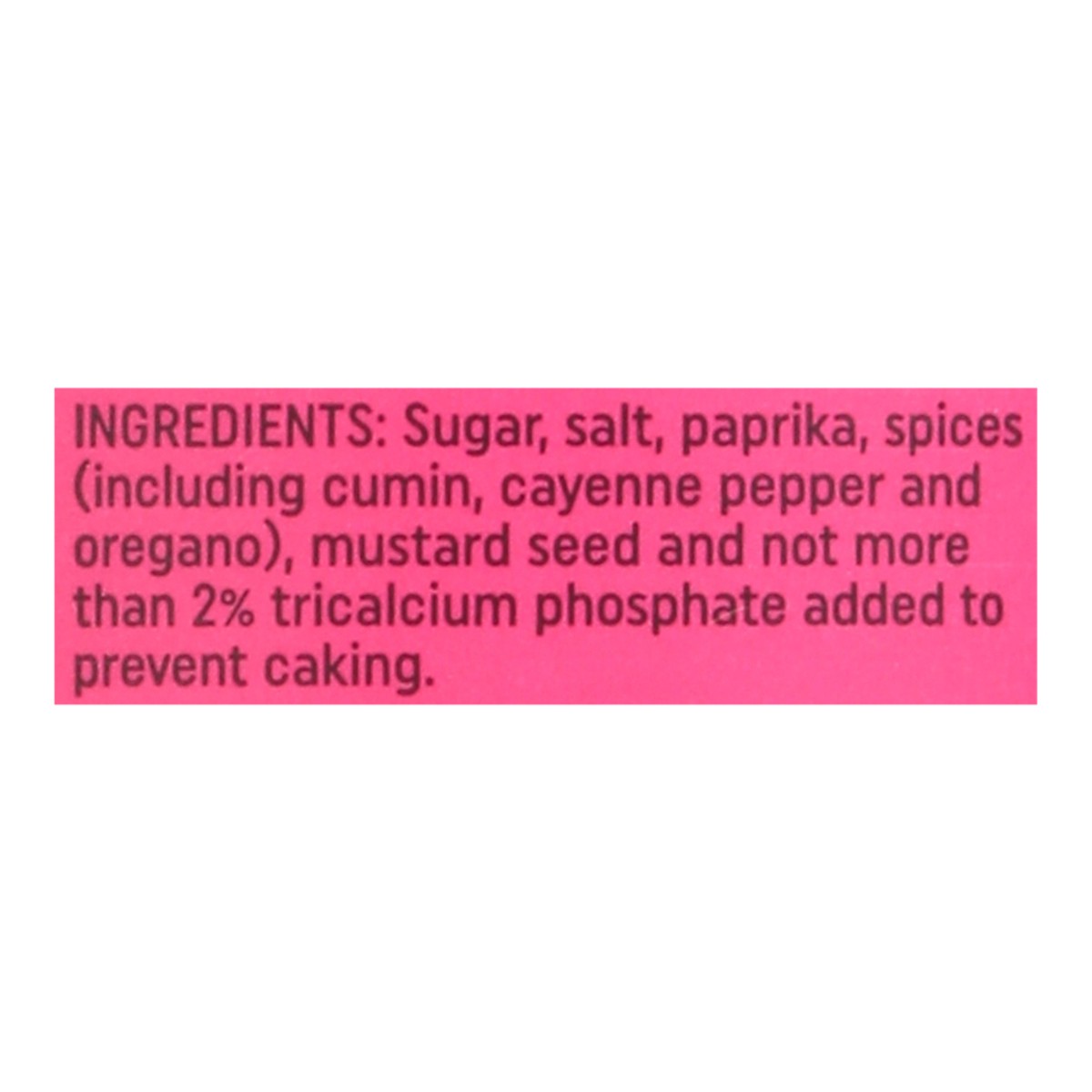 Sugar, Salt, Paprika, Spices (Including Cumin, Cayenne Pepper and Oregano), Mustard Seed and Not More than 2% Tricalcium Phosphate Added to Prevent Caking.