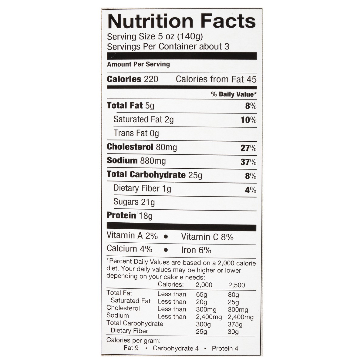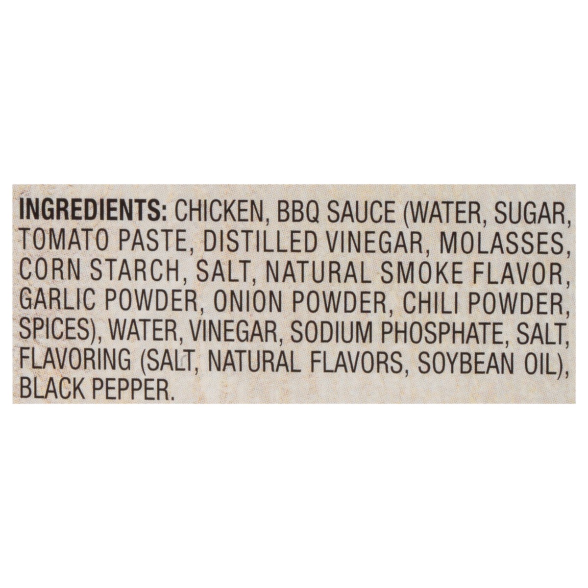 Chicken, BBQ Sauce (Water, Sugar, Tomato Paste, Distilled Vinegar, Molasses, Corn Starch, Salt, Natural Smoke Flavor, Garlic Powder, Onion Powder, Chili Powder, Spices), Water, Vinegar, Sodium Phospha…