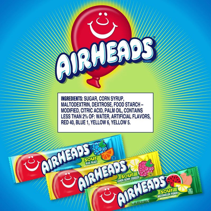 - Airheads candy variety pack includes Sour Watermelon Punch, Sour Lemon Berry Squeeze and Sour Blue Blast chewy candy