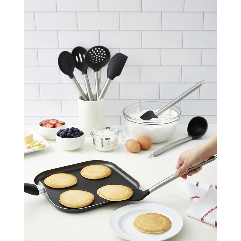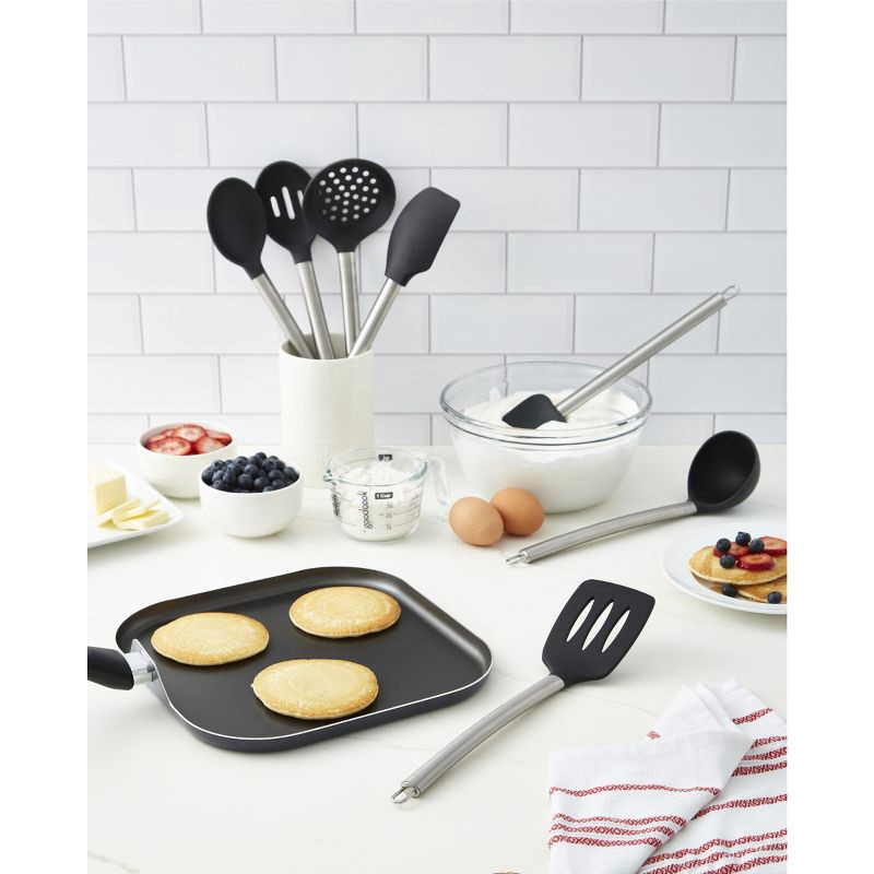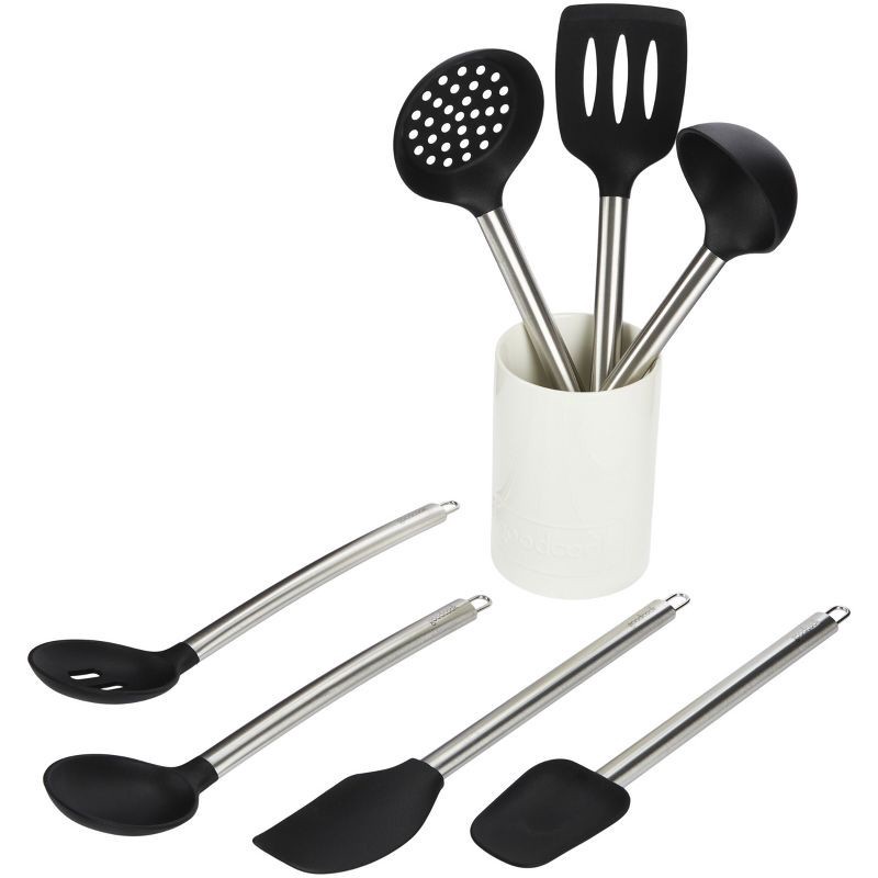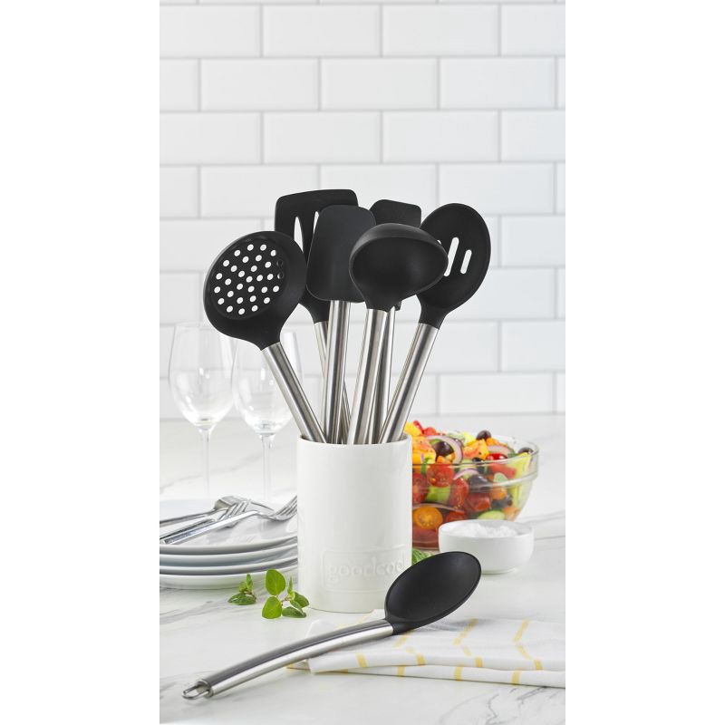 Our GoodCook Ready Tool Set includes 7 essential tools, along with a crock for convenient storage on the counter. The ladle, skimmer, slotted spoon, slotted turner, basting spoon, and turner are all m…
