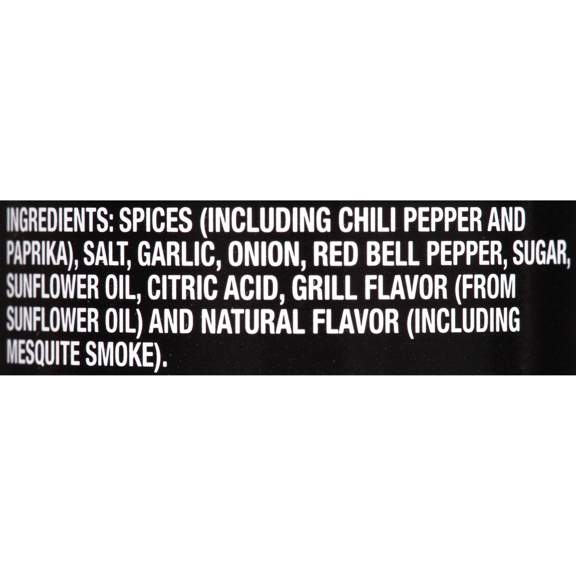 Spices (Including Chili Pepper and Paprika), Salt, Garlic, Onion, Red Bell Pepper, Sugar, Sunflower Oil, Citric Acid, Grill Flavor (from Sunflower Oil) and Natural Flavor (Including Mesquite Smoke).