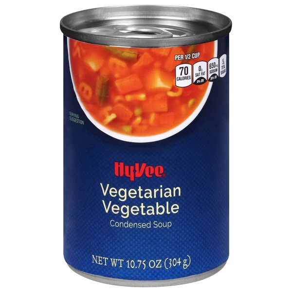 WATER, POTATOES, CARROTS, TOMATO PUREE (WATER, TOMATO PASTE), PEAS, CORN, GREEN BEANS, ENRICHED PASTA (WHEAT FLOUR, WATER, EGG WHITE, NIACIN, IRON [FERROUS SULFATE], THIAMIN MONONITRATE, RIBOFLAVIN, F…