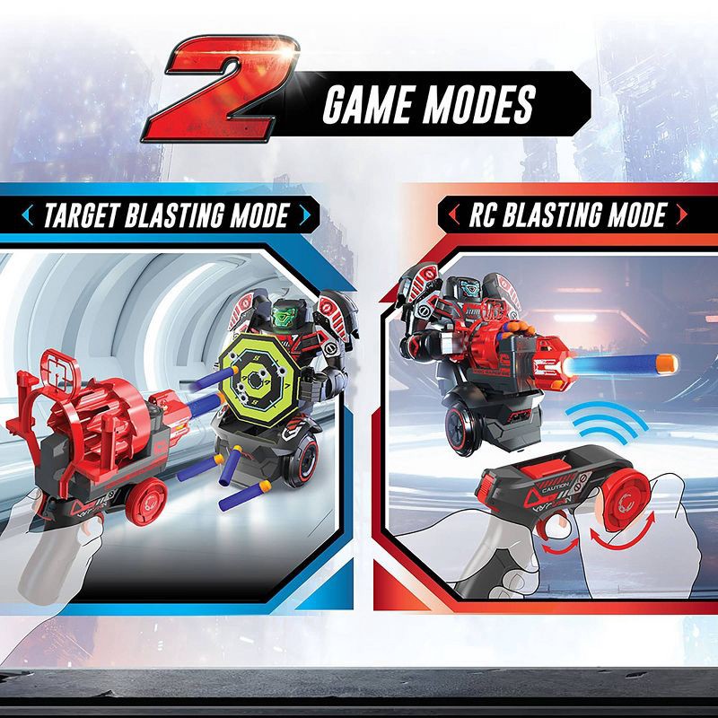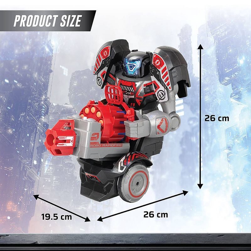 - 2-in-1 design: robot transforms into a moving target while remote converts into a dart blaster