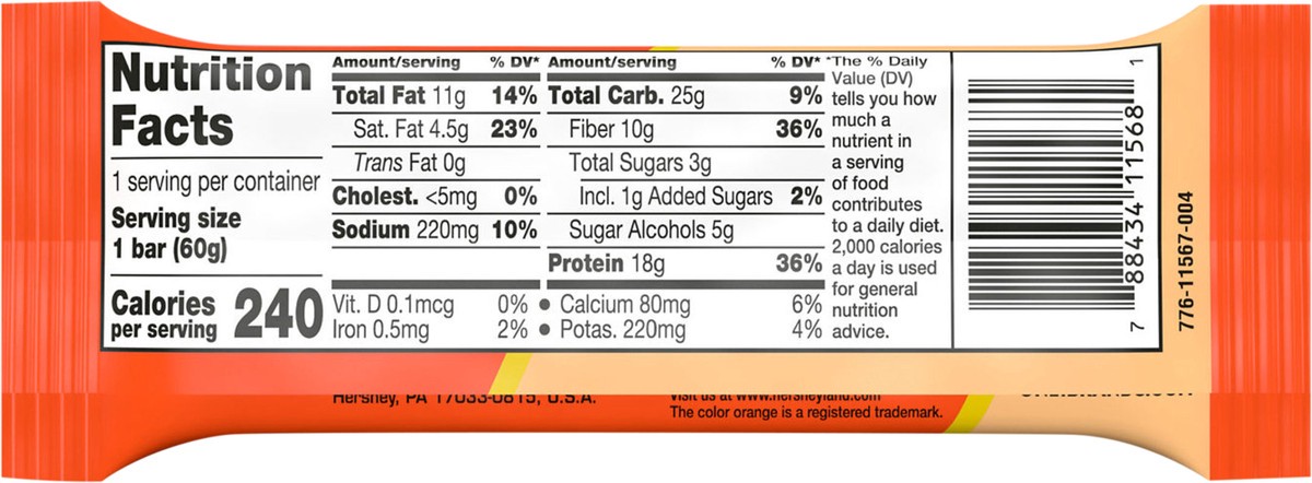 Flavor inspired protein bar. Flavored with other natural flavors. 18 g protein. 3 g sugar. Gluten free. See nutrition information for saturated fat content. You've found the one. www.askhershey.com. w…