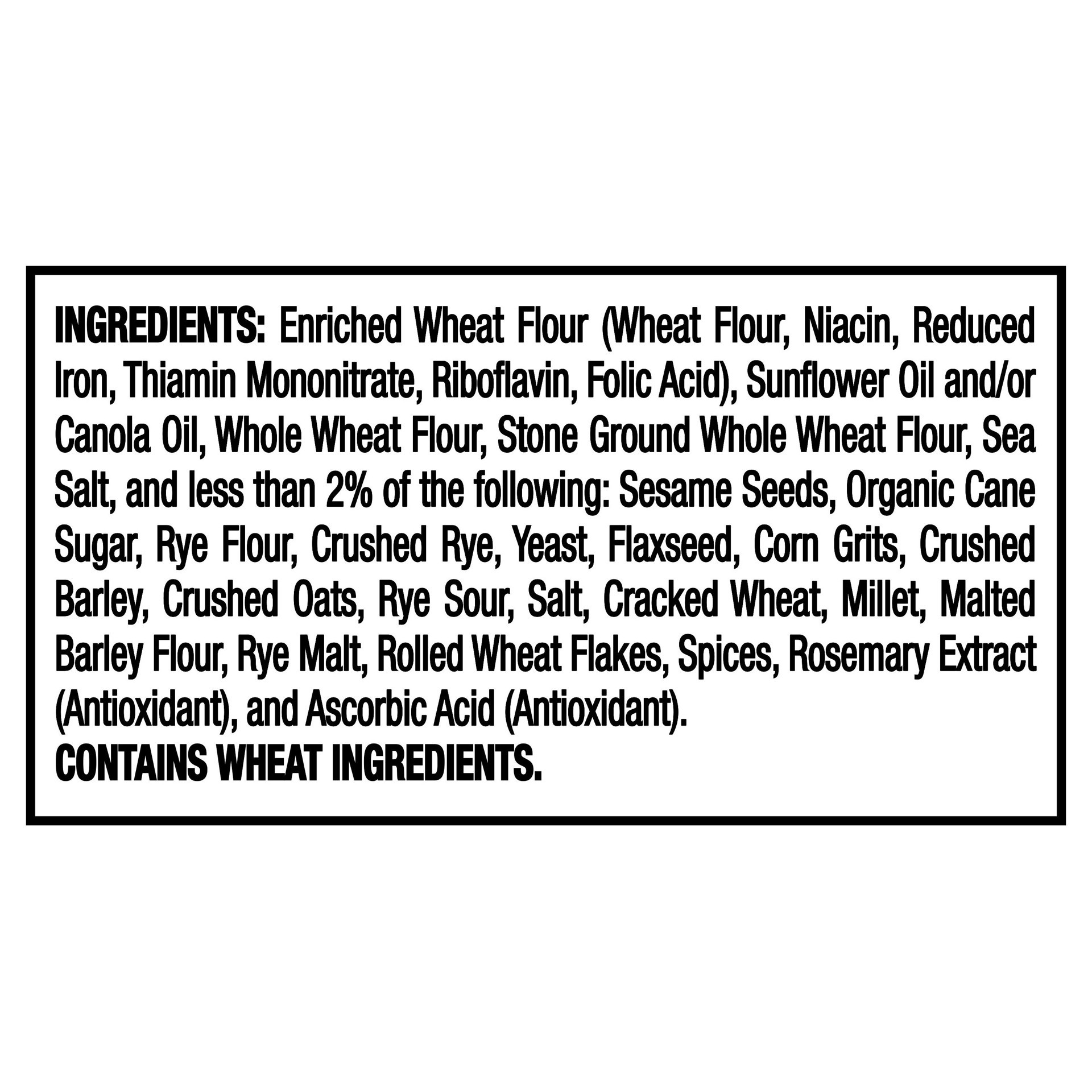 Enriched Wheat Flour (Wheat Flour, Niacin, Reduced Iron, Thiamin Mononitrate, Riboflavin, Folic Acid), Sunflower Oil and/or Canola Oil, Whole Wheat Flour, Stone Ground Whole Wheat Flour, Sea Salt, and…