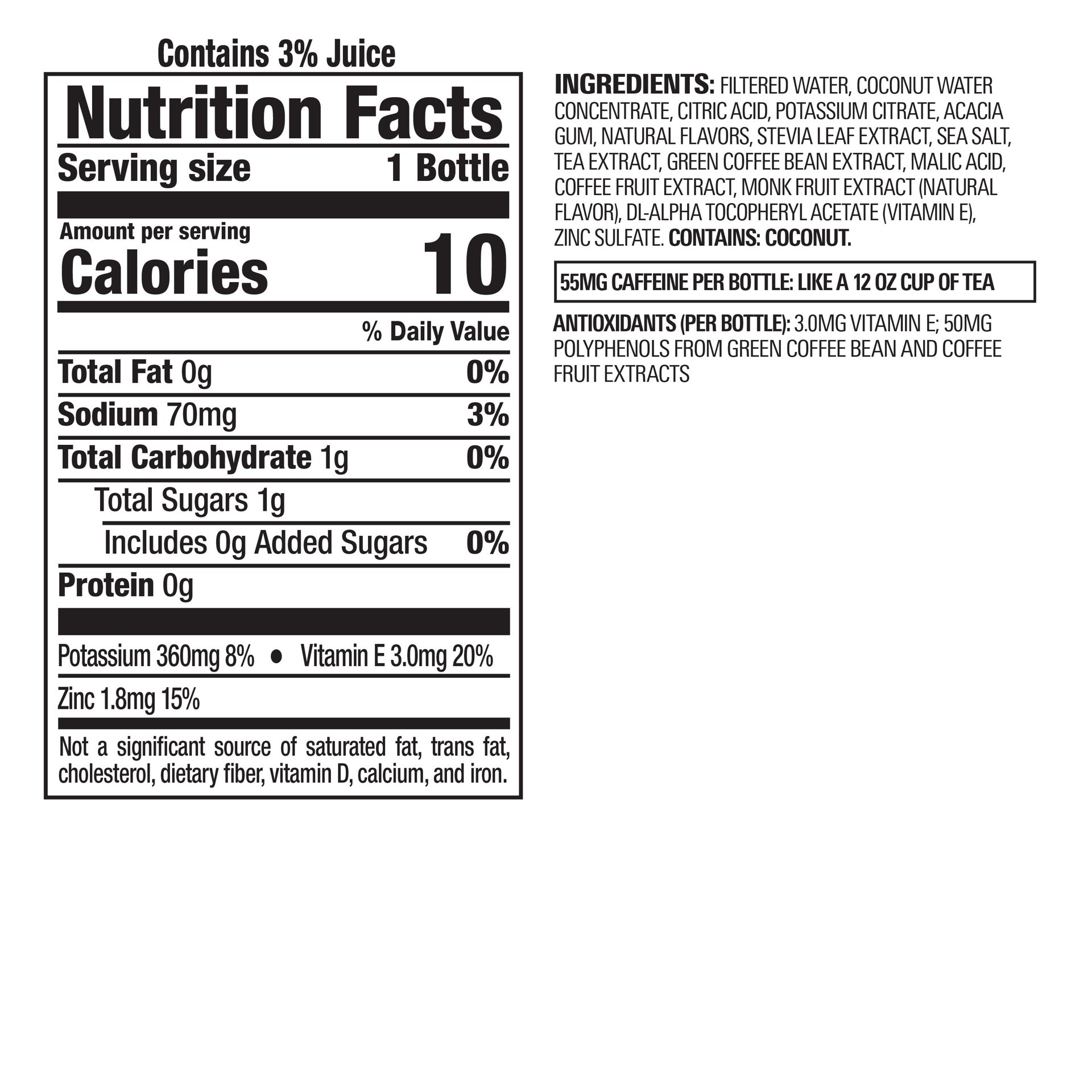 Filtered Water, Coconut Water Concentrate, Citric Acid, Potassium Citrate, Acacia Gum, Natural Flavors, Stevia Leaf Extract, Sea Salt, Tea Extract, Green Coffee Bean Extract, Malic Acid, Coffee Fruit …