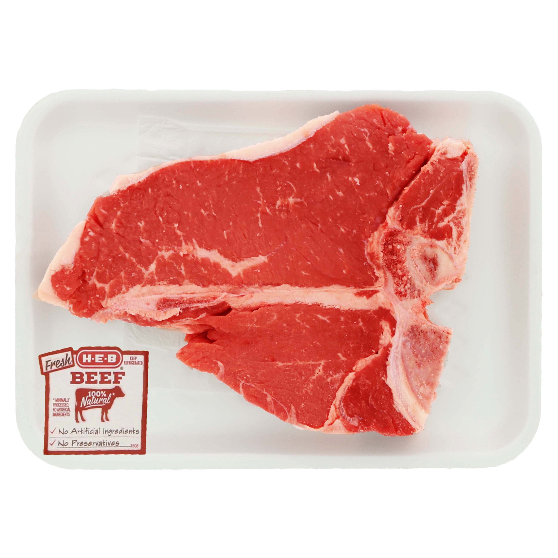 H-E-B USDA Select T-Bone Steak is strip steak and filet mignon in one, separated and insulated by bone, keeping the meat juicy while cooking.Always 100% Natural and no artificial ingredients or preser…