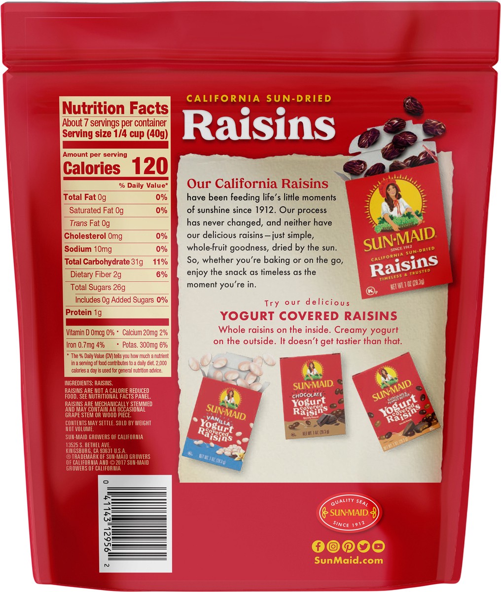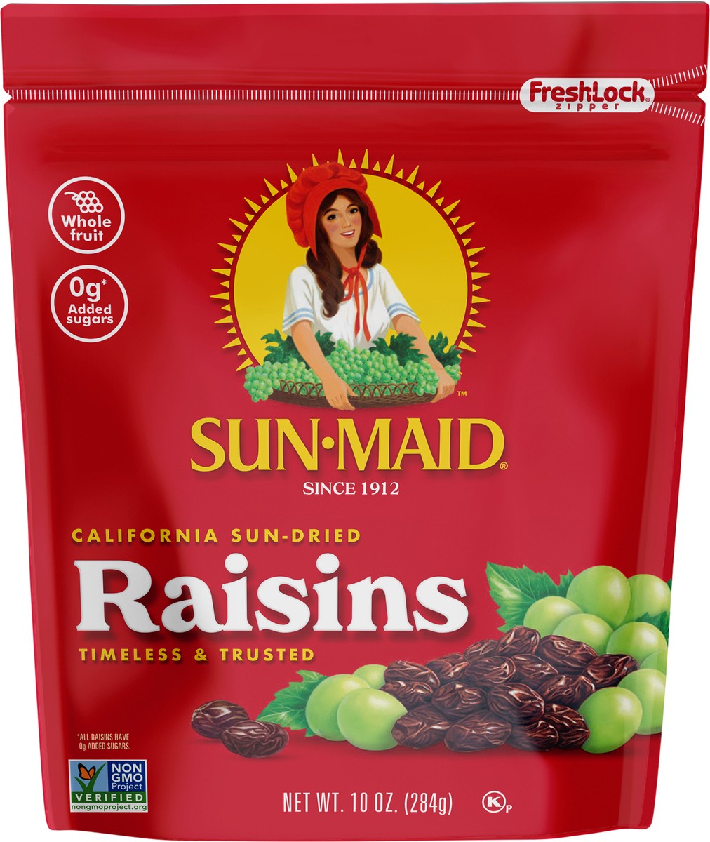 Sun-Maid California Sun-Dried Raisins - Made with nothing but grapes and California sunshine, Sun-Maid Raisins'' timeless and trusted goodness has been a healthy snack for kids and grown-up kids alikeā¦