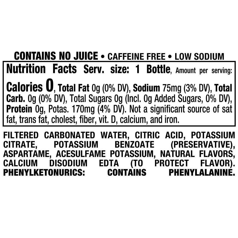 Filtered Carbonated Water, Citric Acid, Potassium Citrate, Potassium Benzoate (Preservative), Aspartame, Acesulfame Potassium, Natural Flavors, Calcium Disodium EDTA (to Protect Flavor).