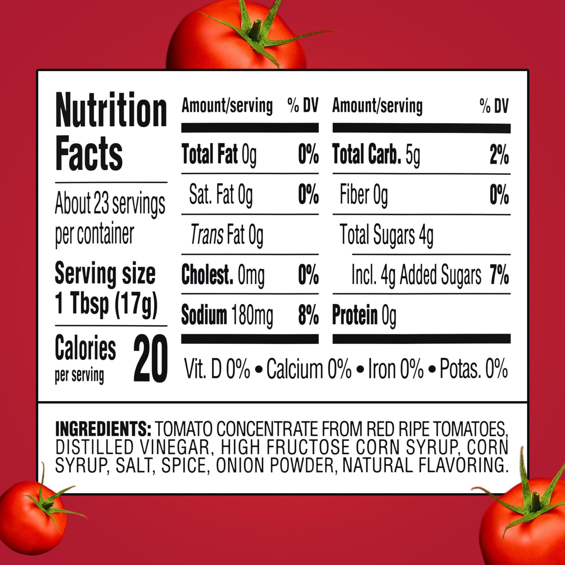 TOMATO CONCENTRATE FROM RED RIPE TOMATOES, DISTILLED VINEGAR, HIGH FRUCTOSE CORN SYRUP, CORN SYRUP, SALT, SPICE, ONION POWDER, NATURAL FLAVORING.