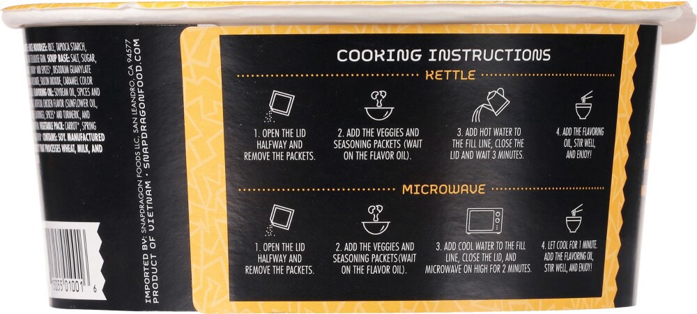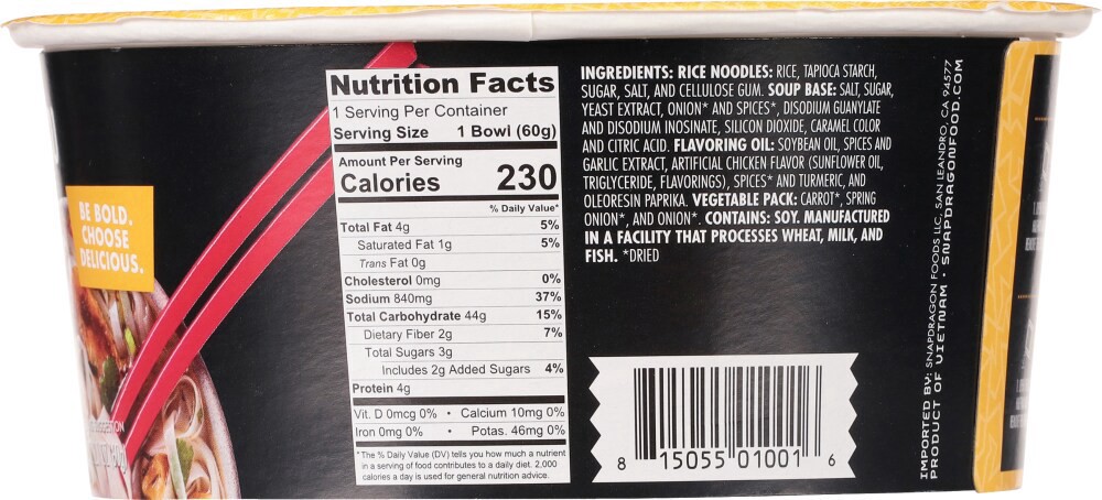 Rice Noodles: Rice, Tapioca Starch, Sugar, Salt, and Cellulose Gum. Soup Base: Salt, Sugar, Yeast Extract, Onion* and Spices*, Disodium Guanylate and Disodium Inosinate, Silicon Dioxide, Caramel Color…