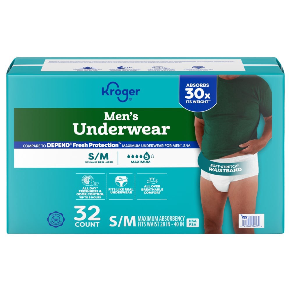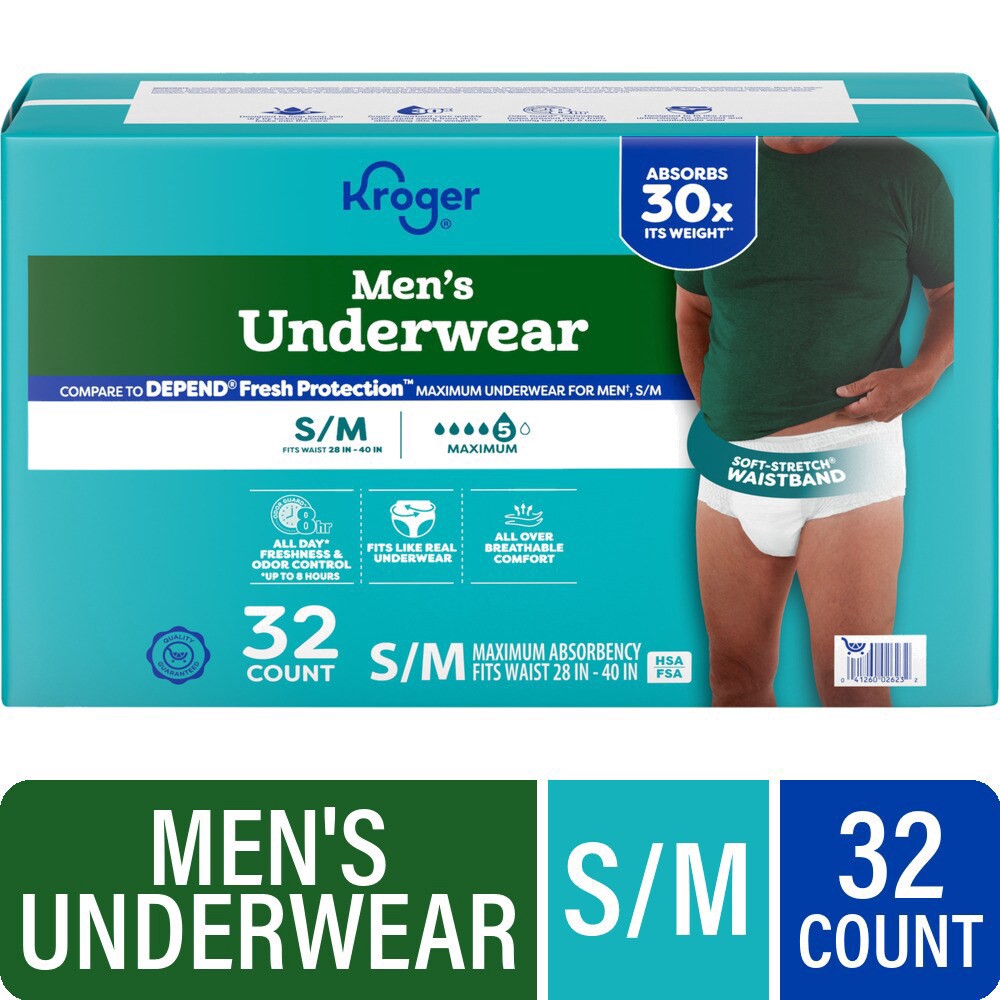 Kroger® Adult Incontinence Underwear for Men Maximum Absorbency Small Medium ensures all dayˆ freshness and odor control. Crafted for a snug fit with a Soft-Stretch® Waistband, these underwear comfort…