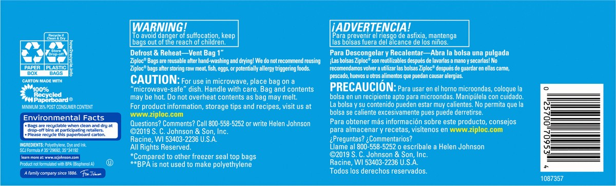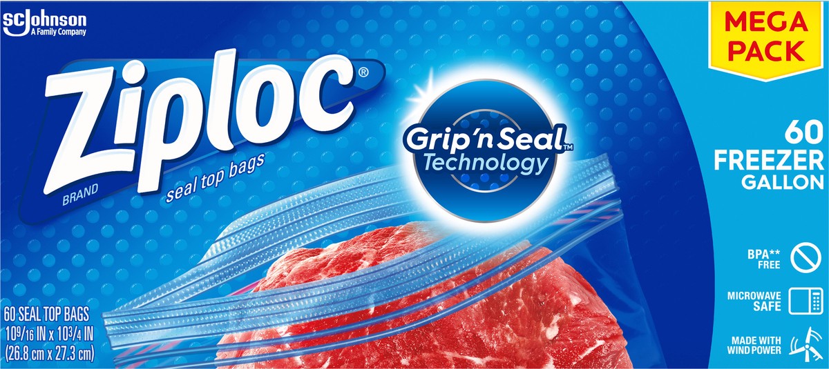 SC Johnson a family company. Grip ''n seal technology. Microwave safe. Strong enough to use again. A family company since 1886. - Fisk Johnson. Made with wind power. Environmental Facts: Bags are recy…
