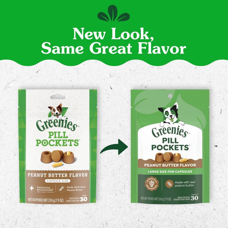 - 7.9 oz. Pouch: One (1) 7.9 oz. pouch of Greenies Pill Pockets For Dogs, Large Size Soft Dog Treats, Peanut Butter Flavor.