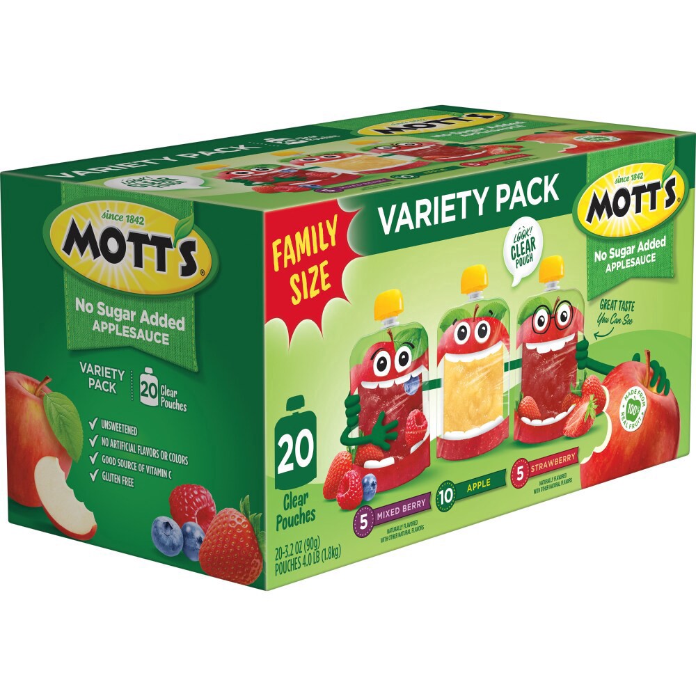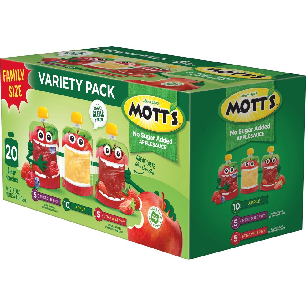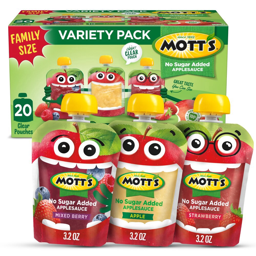 - REAL FRUIT: Mott''s Applesauce Variety Pack pouches are made with real fruit and no added sugar.