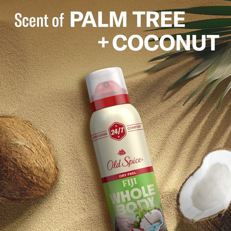 - AMAZING SCENT: Experience a breakthrough scent with Old Spice Whole Body Deodorant. Powered by 100% natural nitrogen propellant, this spray offers a contactless application with scent of Palm Tree and Coconut.