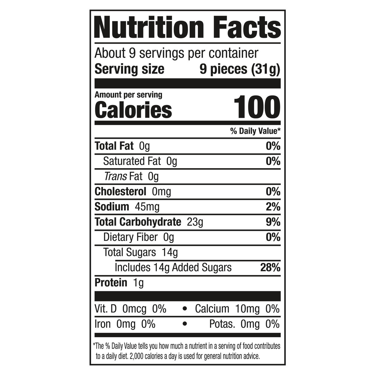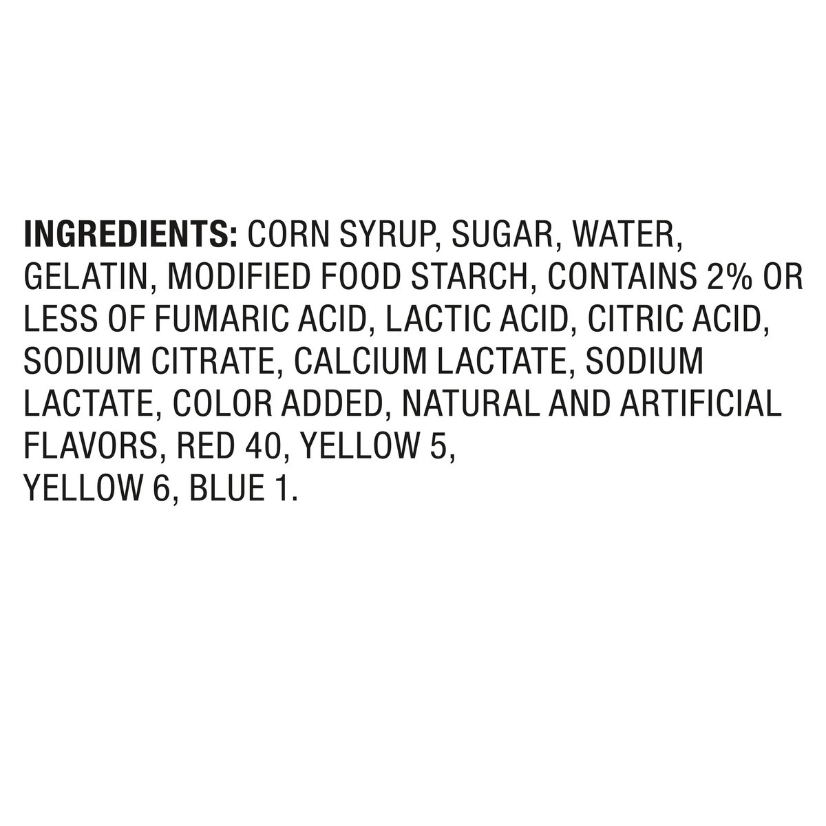 Corn Syrup, Sugar, Water, Gelatin, Modified Food Starch, Contains 2% or Less of Fumaric Acid, Lactic Acid, Citric Acid, Sodium Citrate, Calcium Lactate, Sodium Lactate, Color Added, Natural and Artifi…