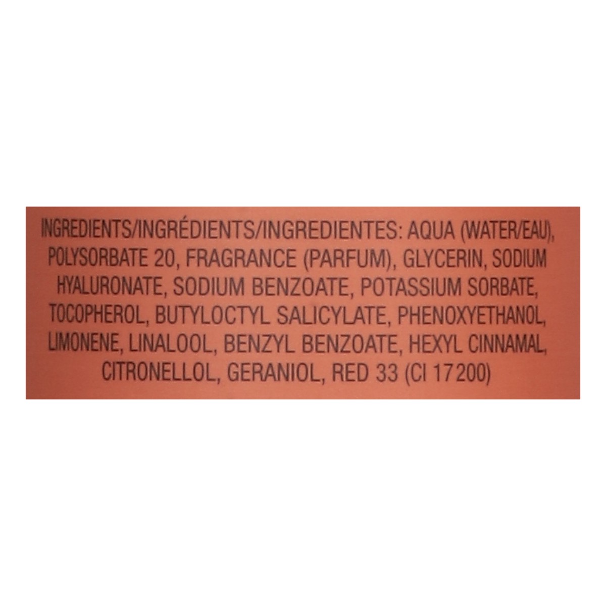 Aqua (Water/Eau), Polysorbate 20, Fragrance (Parfum), Glycerin, Sodium Hyaluronate, Sodium Benzoate, Potassium Sorbate, Tocopherol, Butyloctyl Salicylate, Phenoxyethanol, Limonene, Linalool, Benzyl Be…